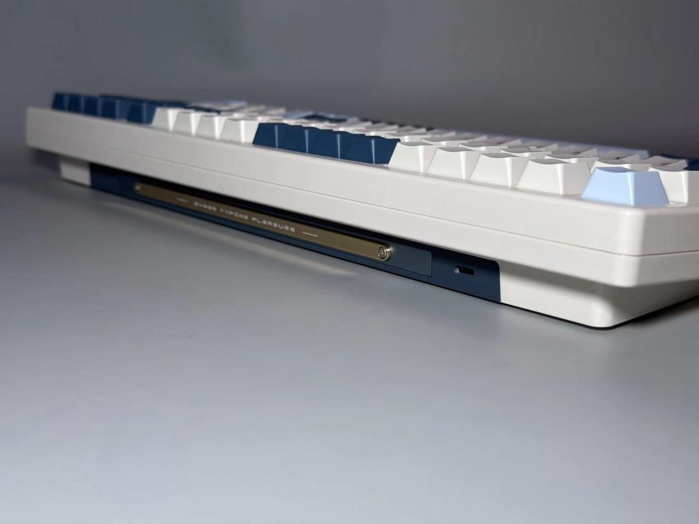 S99的顶部也是设计了一根金色金属条装饰条来提升整把键盘的外观。而Type-c接口位置则是设计在了键盘的左上角位置,这也是客制化中常见的位置,插航插线好看。