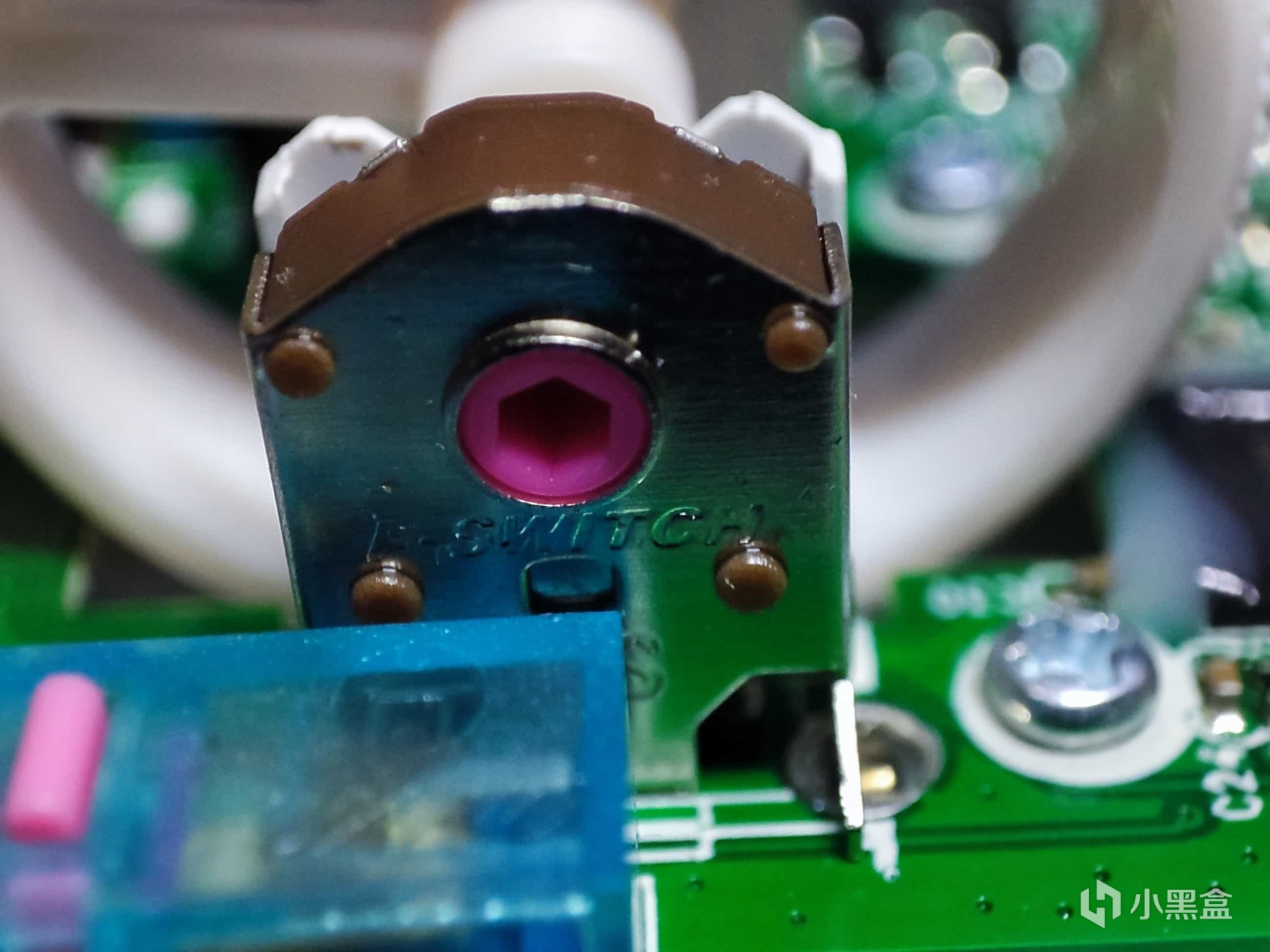 旁边就是PCB板,上面有着PAW3395传感器以及Nordic52833主控。但是主控有些许的溢胶,传感器上面也有残余胶。
