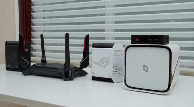 简单介绍一句,我现在使用的是全套的ROG 路由器做的AiMesh,除此之外,还使用了极空间Z4S NAS以及一台mini PC做的软路由。