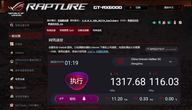 ▲将光猫的2.5G口与路由器的2.5G Wan口连接口,通过ROG红蜘蛛后台的网络速度测试功能测得下载速度为1317Mbps,上传速度为116Mbps,这里我们可以看到下载速度已经大幅超过了1000Mbps,可见所谓的千兆光纤还是有很高的冗余带宽的,如果光猫与路由器均有2.5G网口,则可以彻底跑满光纤的全部带宽。