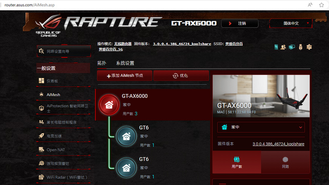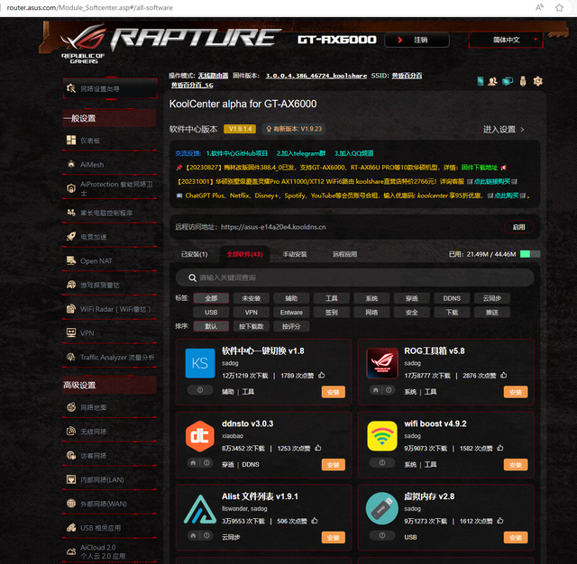 ▲固件方面,华硕路由的开放性可以说是最高的,我这里就刷了第三方固件,刷完之后便可以进入软件市场激活更多的功能了。