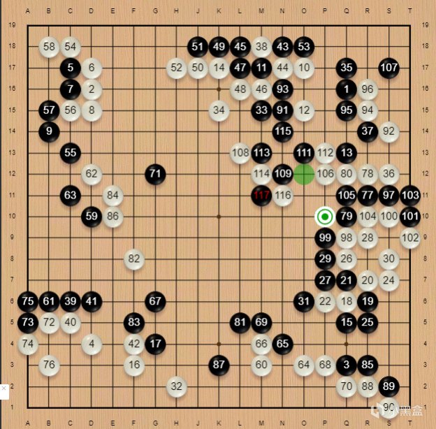 進入到中盤,白棋繼續擴大優勢,勝率始終處於高位,雙方在右上爆發戰鬥,黑117打忽略白棋的交換,隨後羋昱廷白118斷後右邊六子被白棋喫住,白棋實地佔優,柯潔此後陷入劣勢。