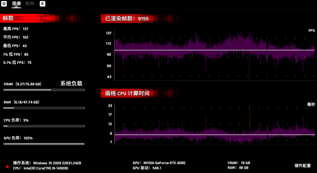 ▲在4K分辨率,预设最高画质,DLSS性能模式下,本电脑可以提供232 FPS的平均帧率,而GPU受限高达99%,简单介绍一下,GPU受限越高,证明显卡性能释放的越充分,所以至少在4K分辨率下,i9-14900K CPU搭配RTX 4080显卡不会出现高U低显的情况。