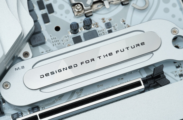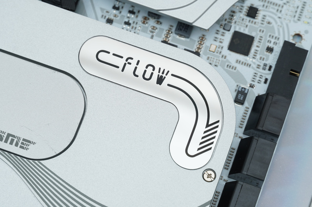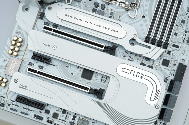 ▲在主板的几块散热装甲上,分别印有GAME CUSTOMIZATION(游戏定制化),DESIGNED FOR FUTURE(为未来设计),FLOW(流体)字样,可以说是信仰满满。