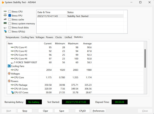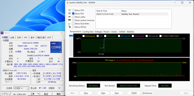 ▲AIDA64 FPU烤机半小时,i9-14900K会一直贴着温度墙运行,频率会稳定在5.2GHz。