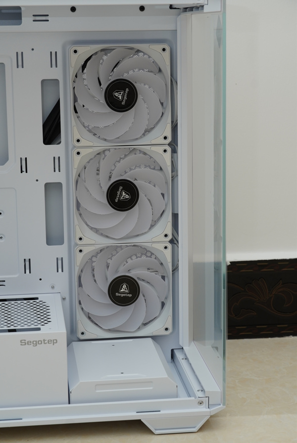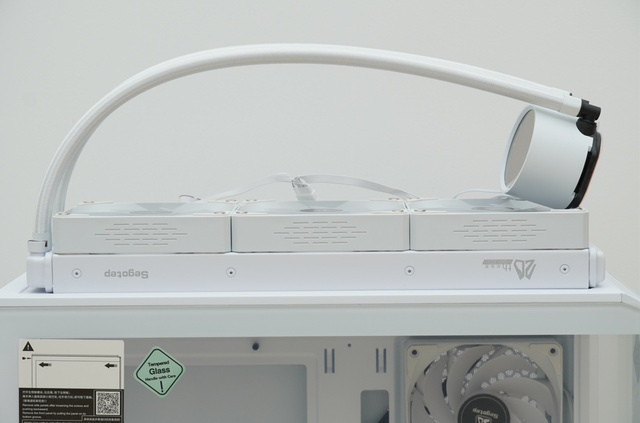 ▲无界1机箱预装了3个白色12 CM ARGB风扇,如有需要,也可拆下则三枚风扇,安装360冷排,再加上机箱顶部也可安装360冷排,无界1机箱可同时安装2个360冷排,十分适合水冷显卡,比如七彩虹水神的装机。