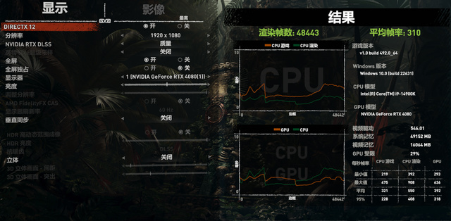 ▲而在1080P分辨率,预设最高画质,DLSS质量模式下,本电脑可以提供310 FPS的平均帧率,此时GPU受限仅为29%,可见,在1080P分辨率下,即使是i9-14900K这样强大的CPU也无法喂饱RTX 4080这种高端Ada架构显卡。