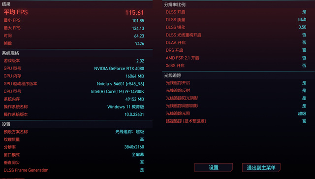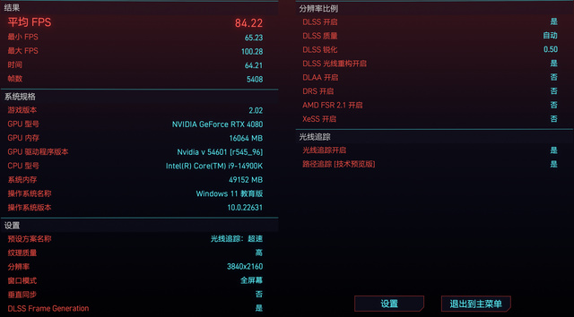 ▲《赛博朋克2077》最近有两个大动作使其再次翻红,其一是DLC《往日之影》的正式发售,其二则是2.0大版本的更新,支持了英伟达的DLSS 3.5技术,最重要的便是DLSS 光线重构功能的支持了,我们依旧使用其内置的Benchmark进行测试。