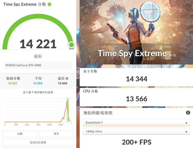 经实测,本电脑Time Spy Extreme得分14221分,其中显卡得分14344分,CPU分数13566分。