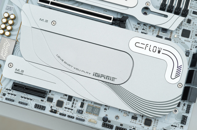 ▲外观方面,iGame Z790D5 FLOW继承了iGame Z690D5 ULTRA的白色版主色调,这款主板在用料上也非常舍得,主板的供电、南桥、SSD、IO接口等发热量大的部分都被很厚重的铝制散热装甲与散热片覆盖。整个主板以波浪为外观主题,外观显得十分的具有动感和科技感。