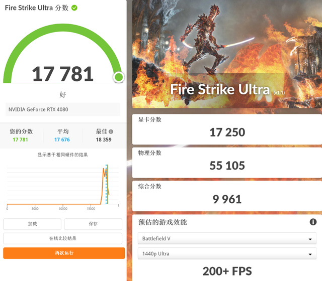 ▲我们首先使用3DMark 适用于高性能游戏电脑和超频系统的 DirectX 11 基准测试Fire Strike Ultra进行测试,其分辨率为4K。经实测,本电脑的3DMark Fire Strike Ultra得分为17781分,其中显卡得分17250分,物理得分55105分,综合分9961分。