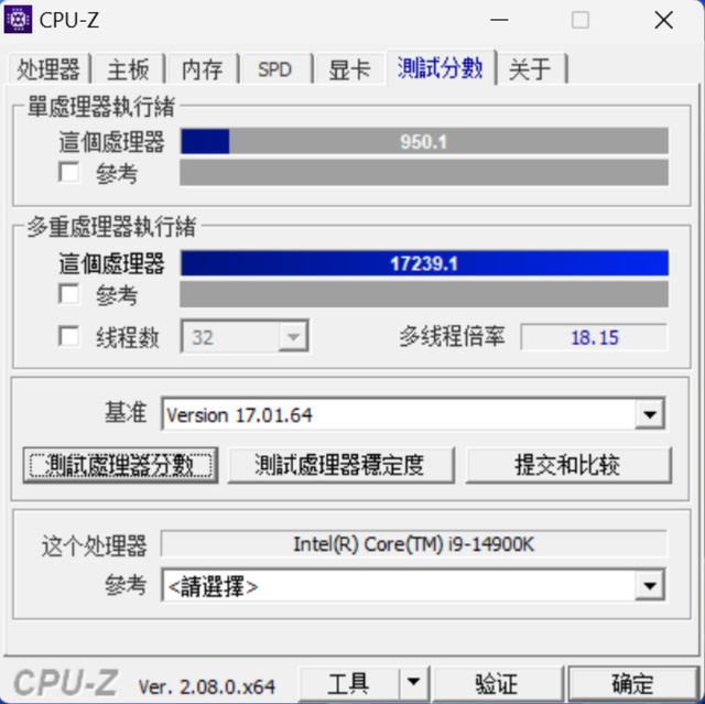▲经实测,i9-14900K的CPU-Z单核得分950.1分,多核得分17239.1分,无论是单核得分,还是多核得分,都非常之优秀。