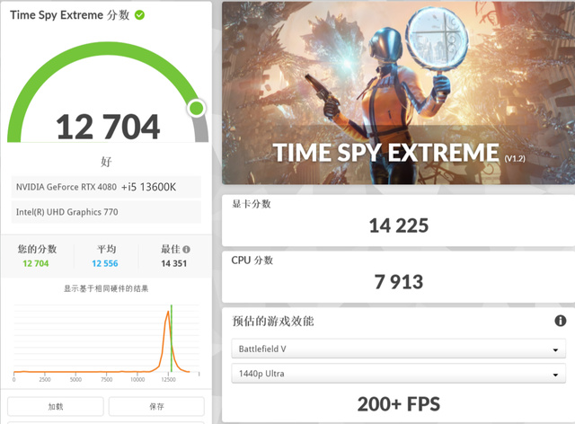 ▲这里多说一句,对多线程更友好的3DMARK Time Spy Extreme测试中,i9-14900K+RTX 4080的组合,相较于i5-13600K+RTX 4080的总得分(12704分)高出1517分,因此,使用高端显卡并游玩较新的3A大作的朋友们,CPU上还是从i7或i9中选择吧。