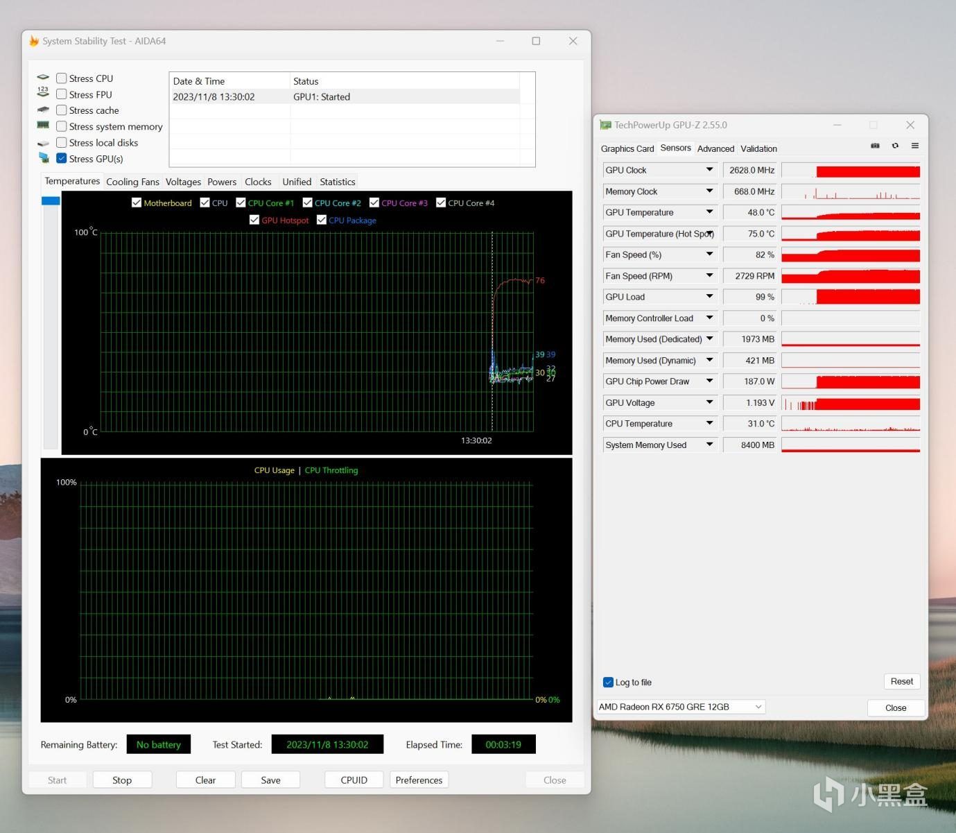 AIDA64 GPU测试,GPU频率最高达2628MHz,结温75°,GPU温度48°。