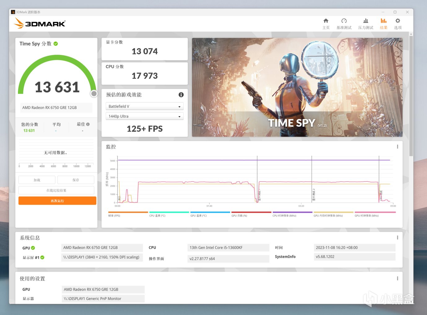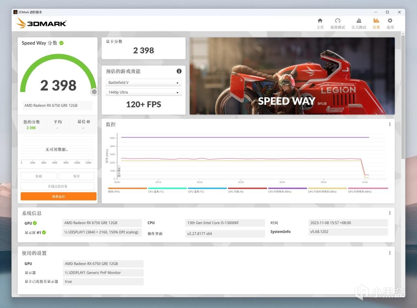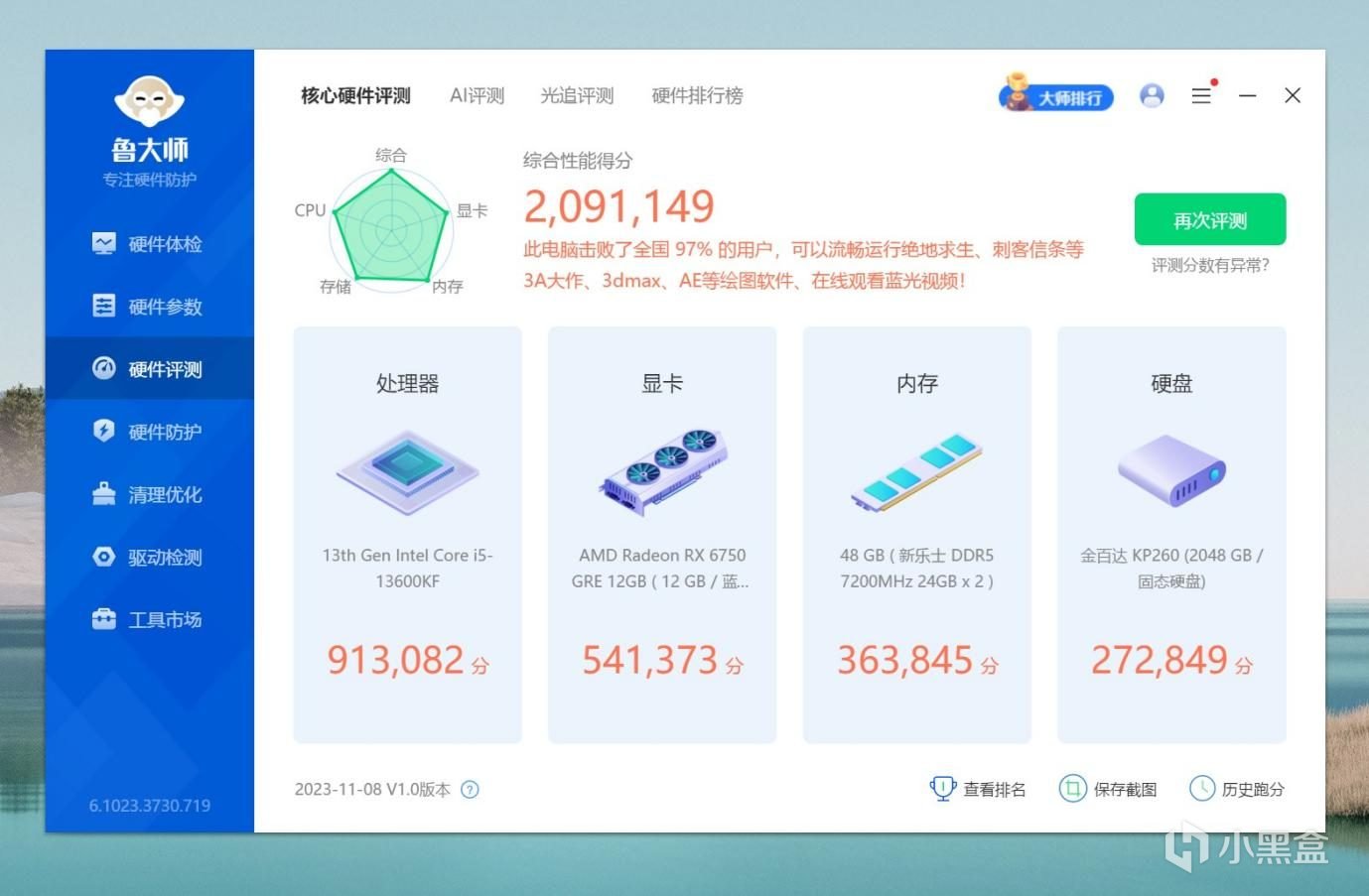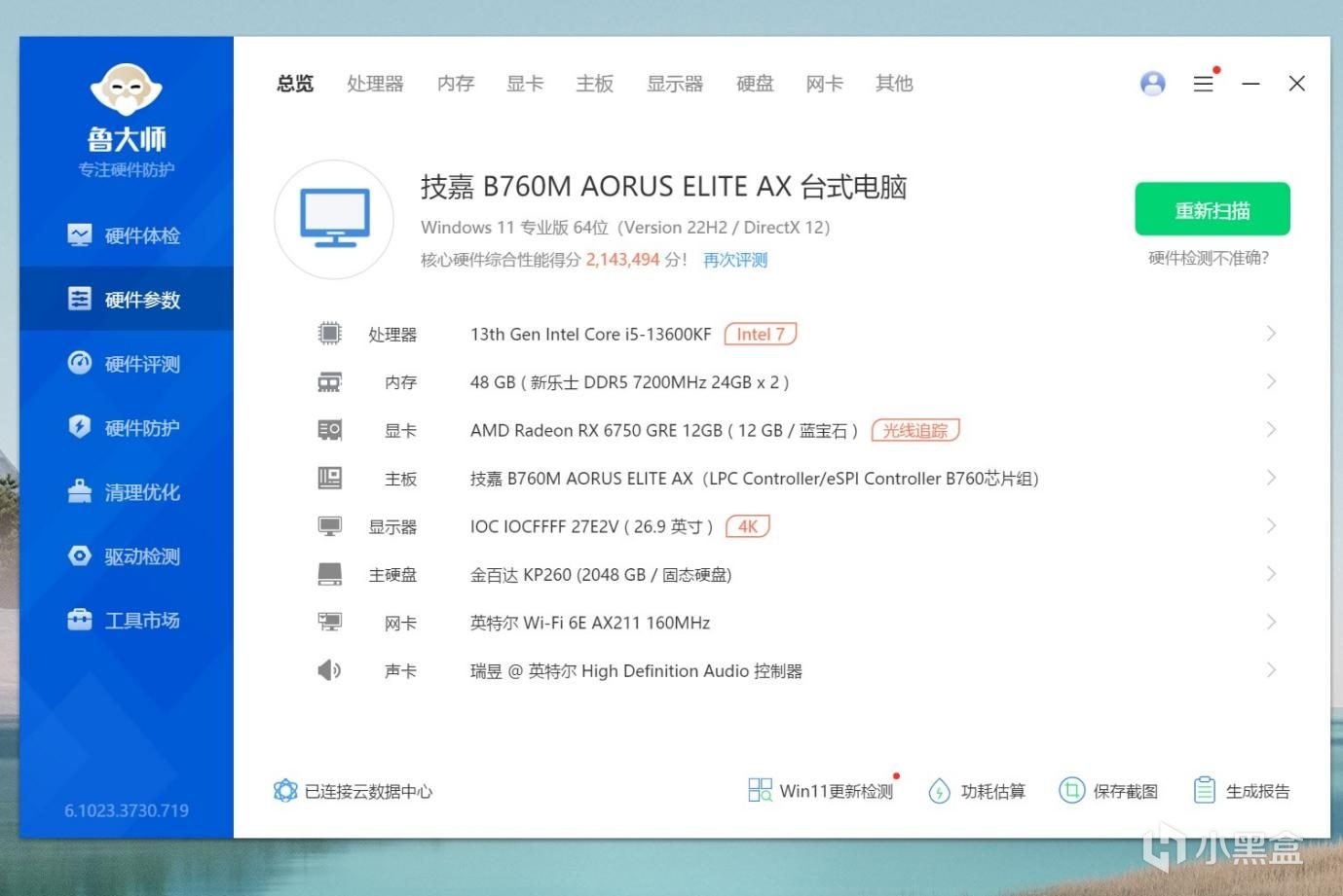 运行鲁大师,看看电脑配置先,CPU是英特尔13600K,内存是新乐士DDR5 48GB,显卡识别出是蓝宝石 RX6750 GRE,主板是技嘉的B760M AORUS ELITE AX,显示器是i-custom元创师的E27高刷新率显示器,硬盘是金百达KP260。