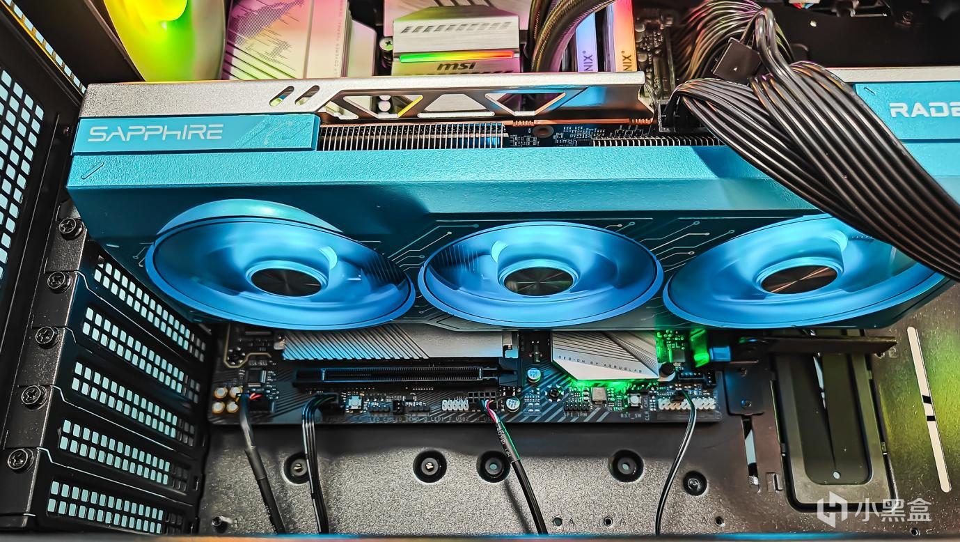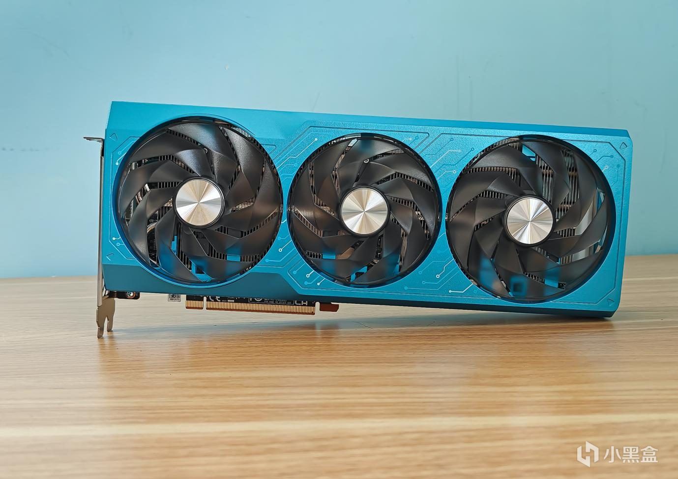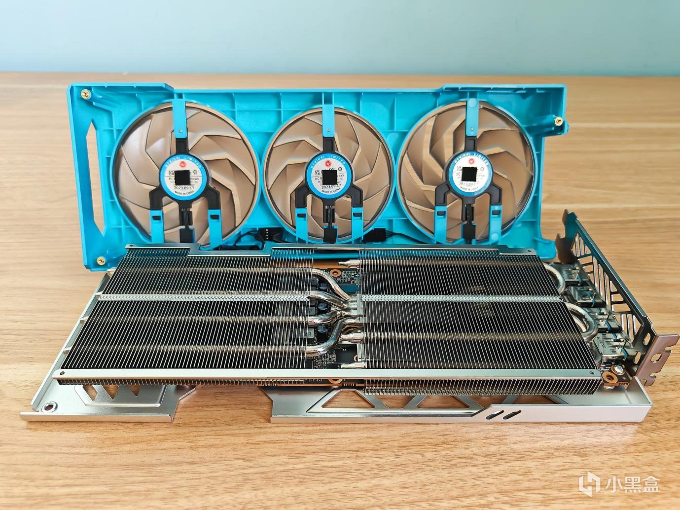 从下面看,3个轴流风扇自带蓝色灯光,同显卡的蓝色外观搭配。