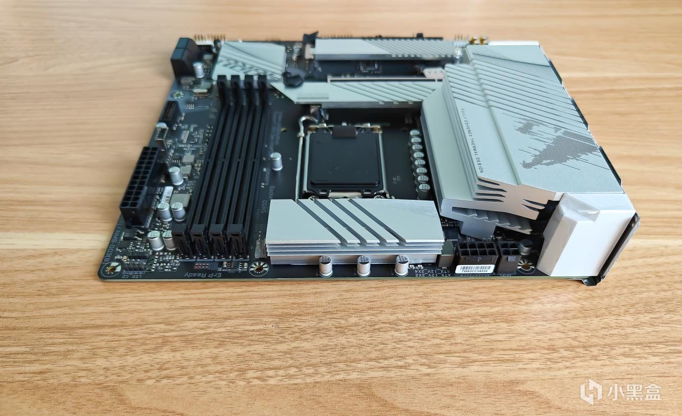 主板是技嘉主板B760M ELITE AX,M-ATX规格,用料很好,做工也很不错。这款主板采用了12+1+1(60A)供电,供电充足。材料采用了超耐久电感、超耐久固态电容,6层2盎司铜电路板,用料精良。黑色底板,搭配银白色的全覆盖散热片和M.2散热装甲。四根内存插槽,最高支持7600+MHz DDR5内存。