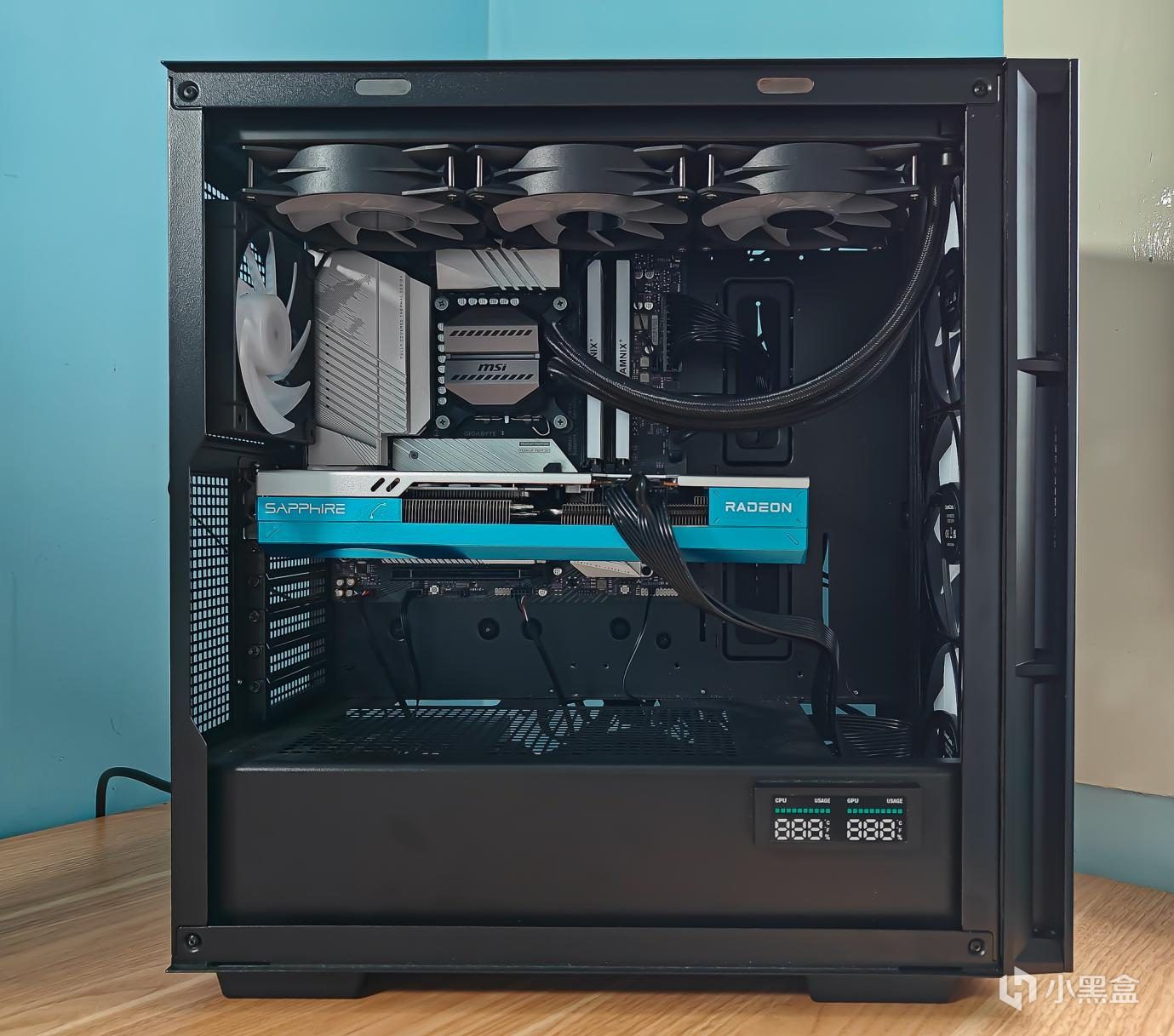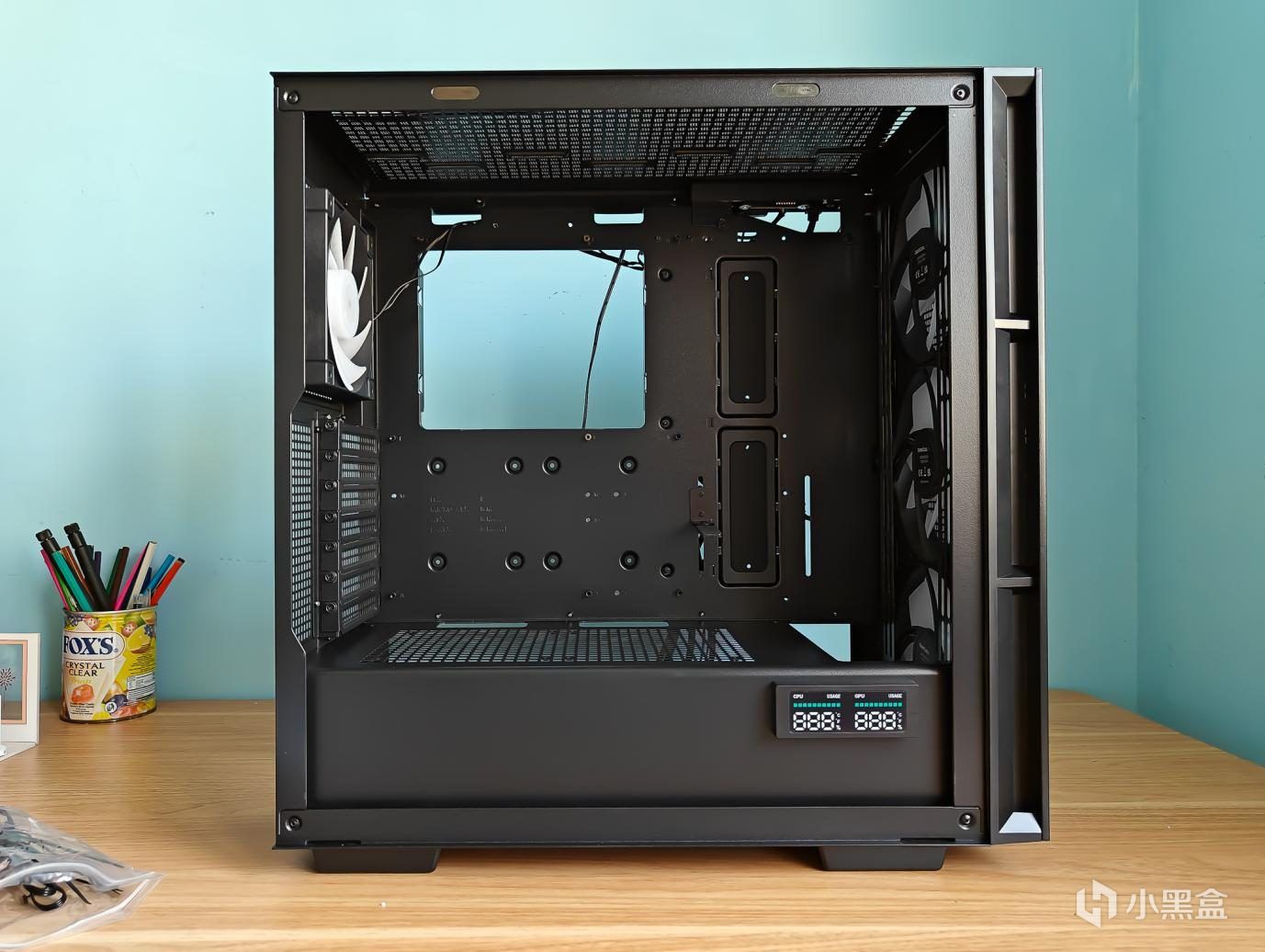 侧透是磁吸的,可以看到右下角的数码管,数码显示,可以方便的了解CPU和显卡的温度、占用率,十分方便。。机箱很宽敞,电源仓顶部是镂空的,可以安装风扇形成垂直风道。出厂机箱后置一个风扇,前面板前置3个风扇。机箱支持多个风扇安装,前面支持3个140mm/120mm风扇,顶部可以安装2个140mm风扇或者3个120mm风扇,后部支持安装一个120mm/140mm风扇,同时电源仓上面可以安装2个120mm风扇。可以支持E-ATX主板,支持最高175mm CPU风冷散热器,支持380mm长显卡,最长支持170cm ATX电源。