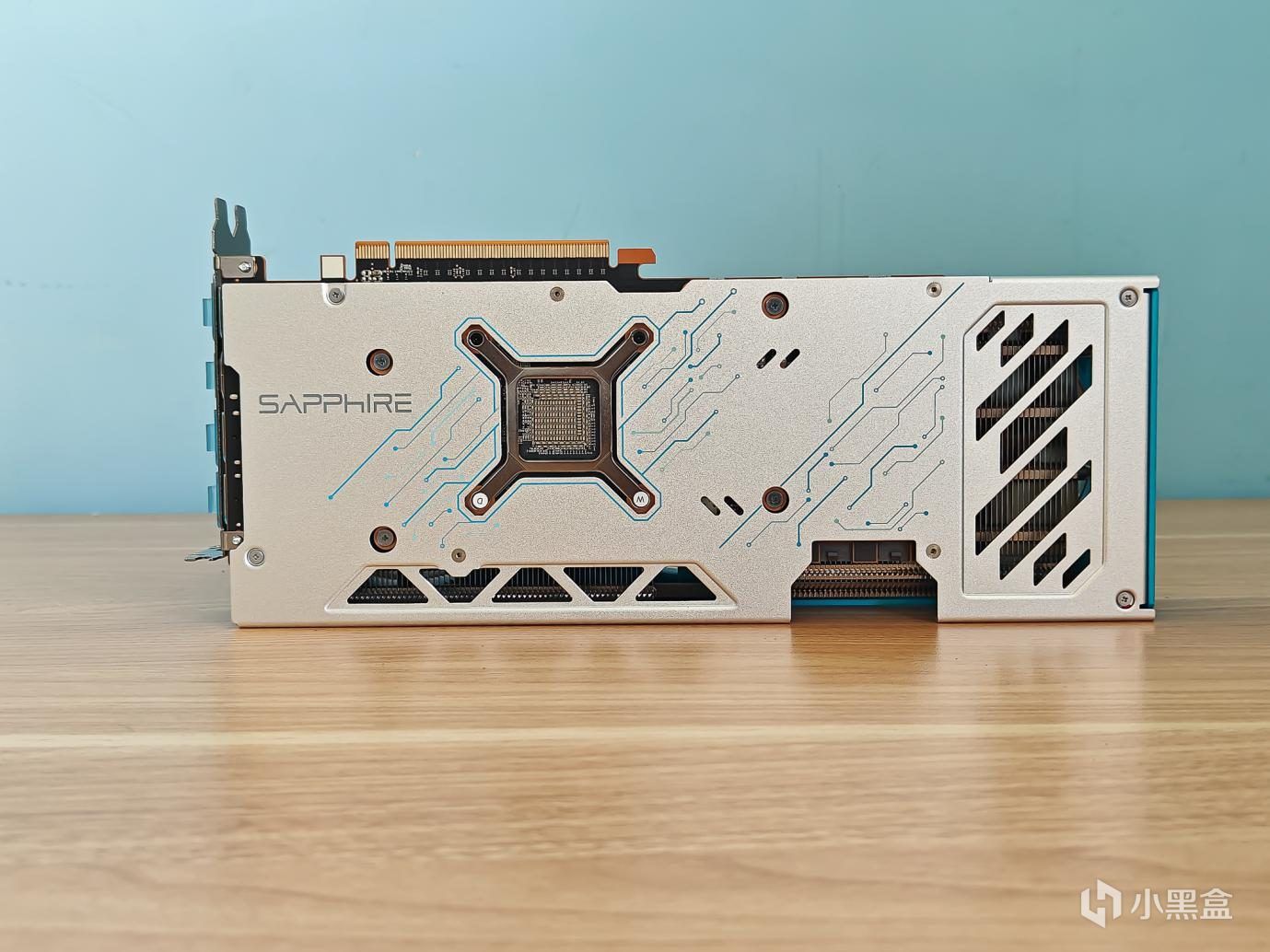 显卡的背面是全尺寸的金属背板,银白色,配以蓝色的电子走线图案,科技感十足。不仅可以对于电路板提供良好的支撑保护,也可以提高散热水平。