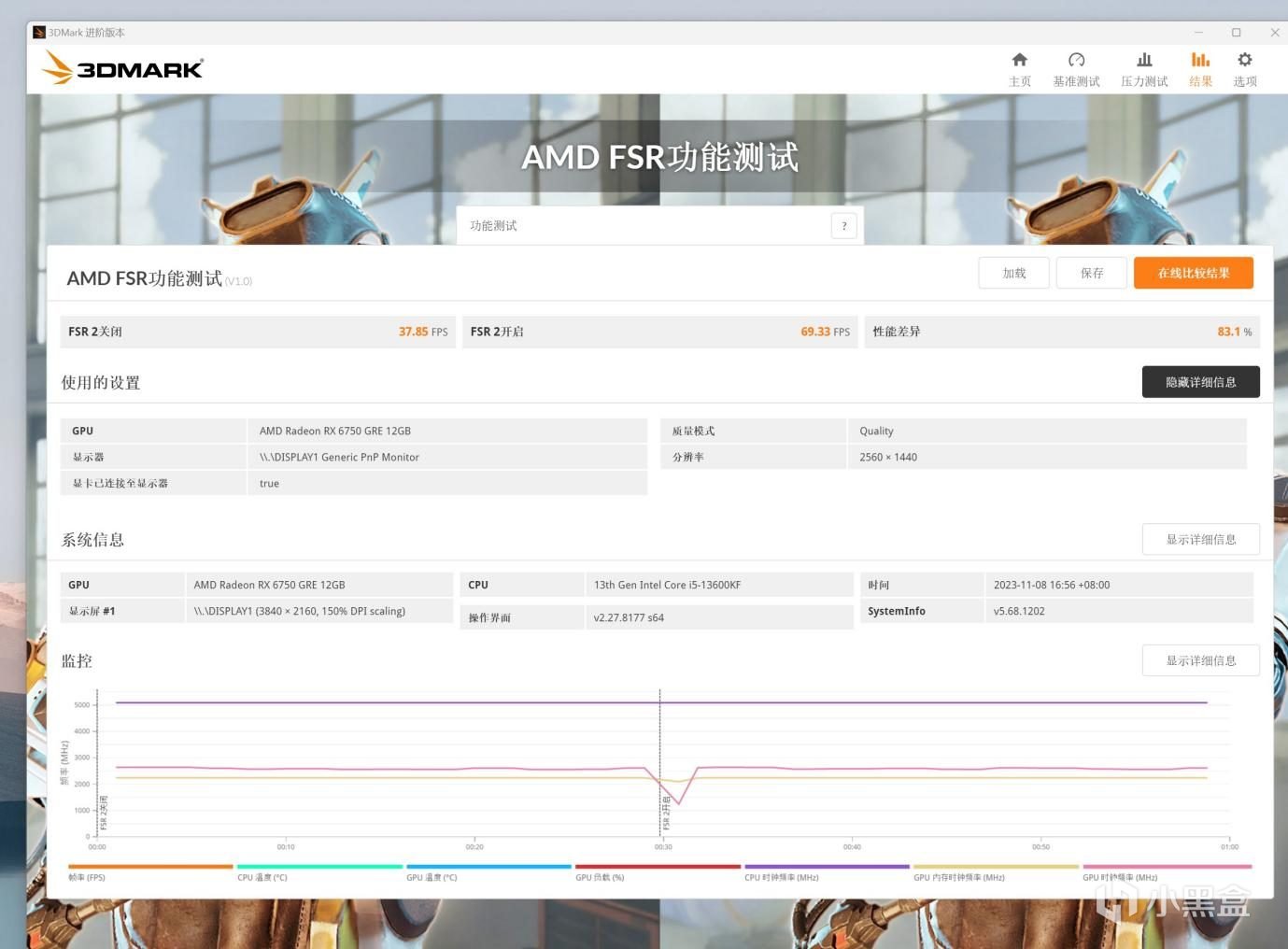 3D MARK的AMD FSR功能测试,选择质量模式,关闭FSR 2 测试,37.85帧,开启后,提升到69.3帧。FSR 有四种不同的质量模式可供选择,四种模式及其缩放级别是: