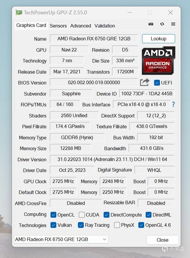 运行GPU,可以看到是7nm工艺,RDNA2架构,Navi 22核心,GDDR6显存,光栅/纹理单元为64/160个12GB显存容量,192bit位宽,431.6 GB/s显存带宽(显存速率16Gbps),加上96MB的AMD Infinity Cache技术加持,表现令人期待。大概是由于这款显卡太新,GPU-Z还没有更新,加速频率和游戏加速频率显示异常。