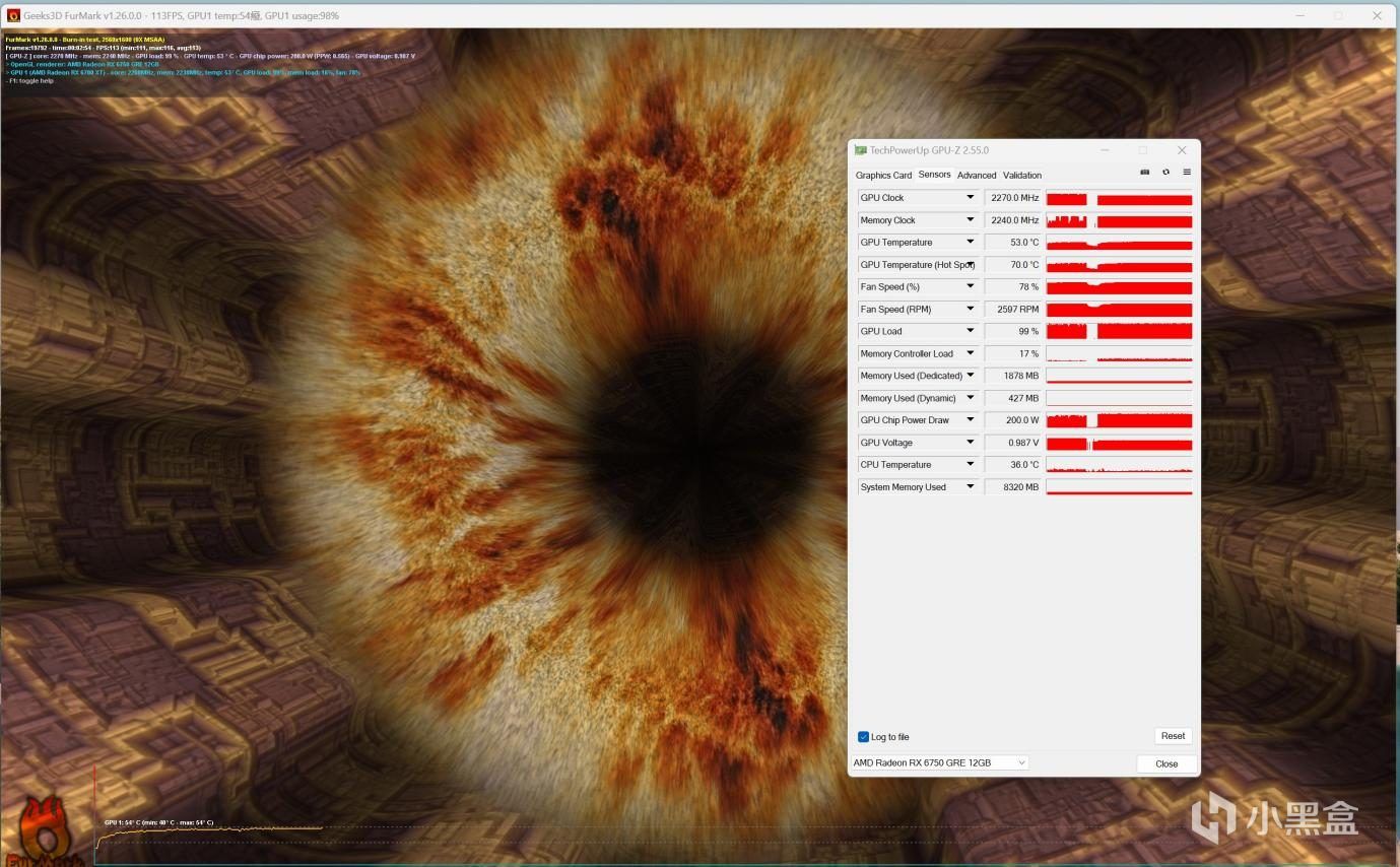 甜甜圈拷机,结温70°,GPU温度53°,功耗200W。