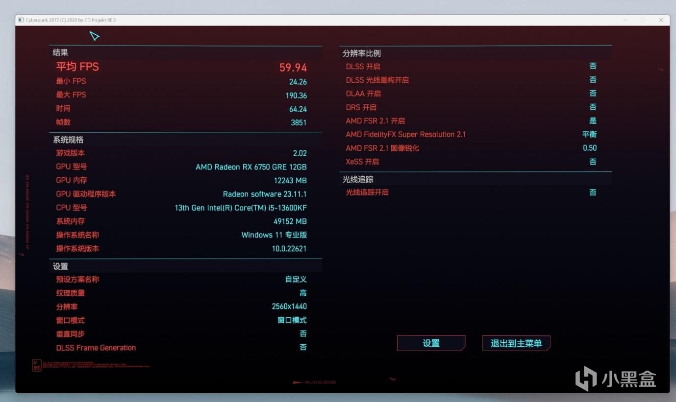 在2K分辨率下,没有开启FSR时候,默认画质下是59.94帧。