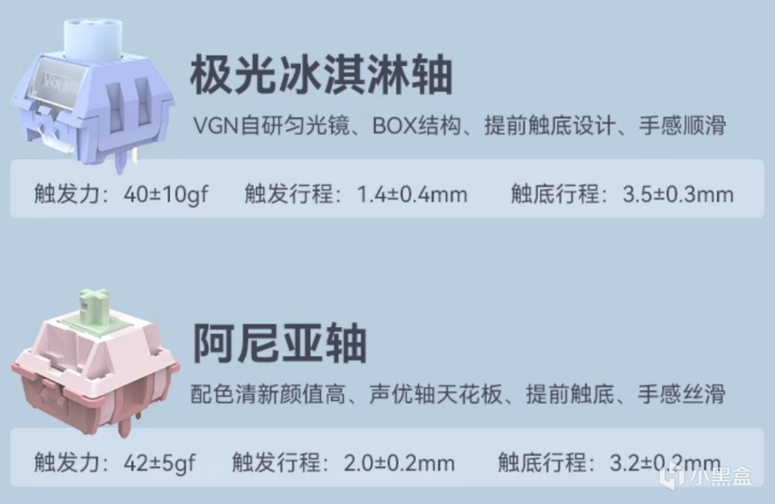 S99同樣是有多款軸體可選,分別是阿尼亞軸和極光冰淇凌軸,前者在客製化圈中的名聲很好,剛出的時候價格我記得大概是2塊多1顆,現在上成品價格過後,整個鍵盤的價格才二三百,性價比很高。