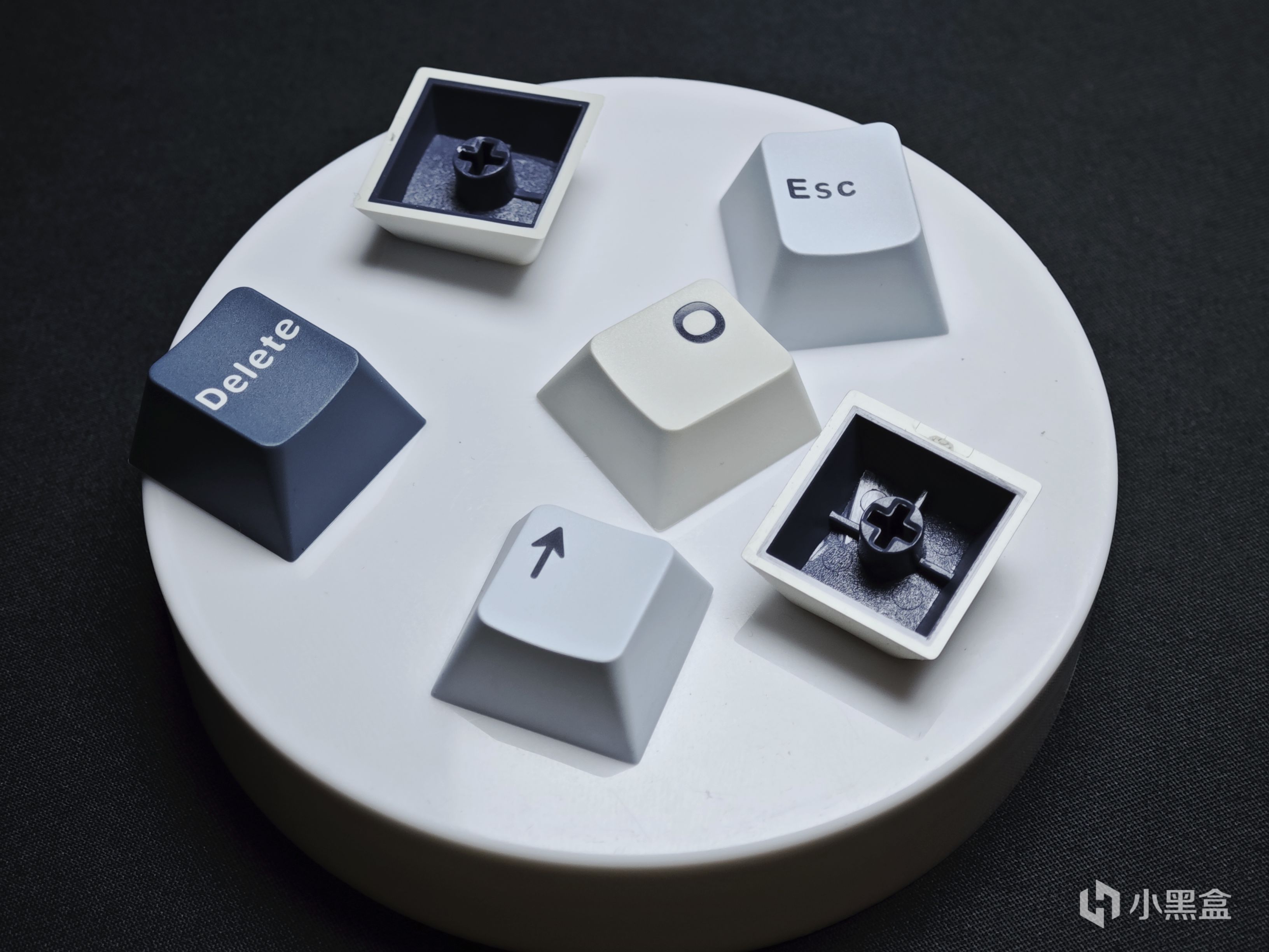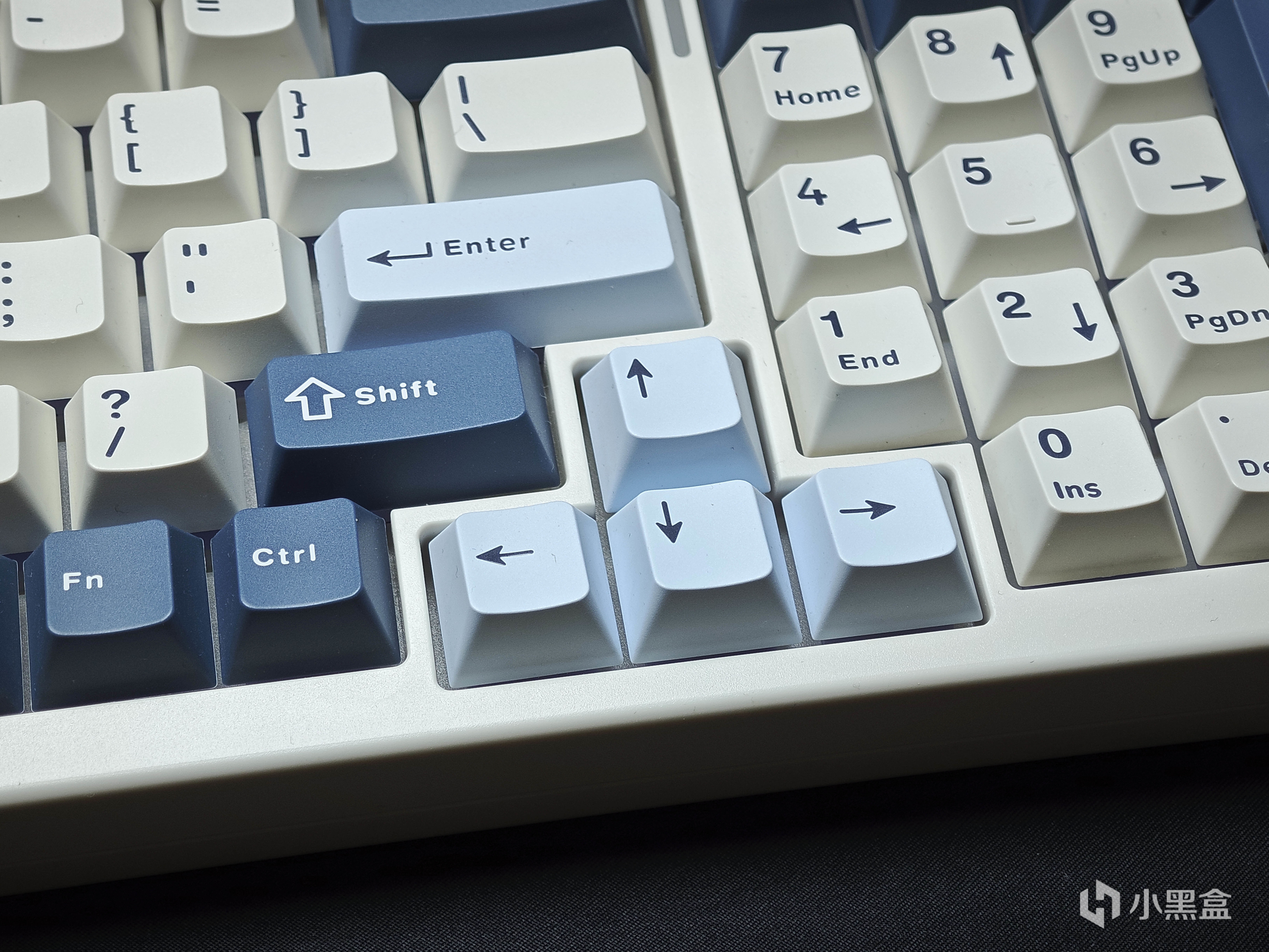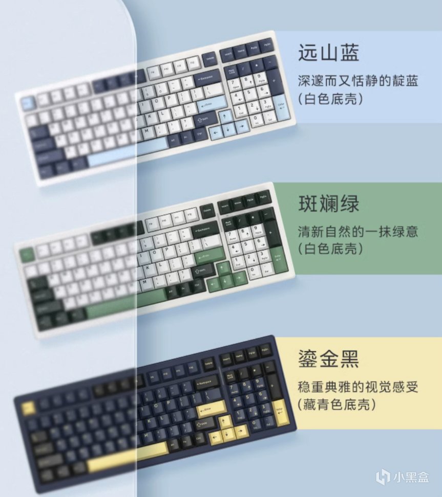 鍵帽有三個版本可選,除了文中的這個遠山藍之外還有斑斕綠以及頂配的鎏金黑,一共三種顏色可選,整體上都是採用PBT材質、雙色注塑工藝製成,在具體的顏色搭配上有所變化。