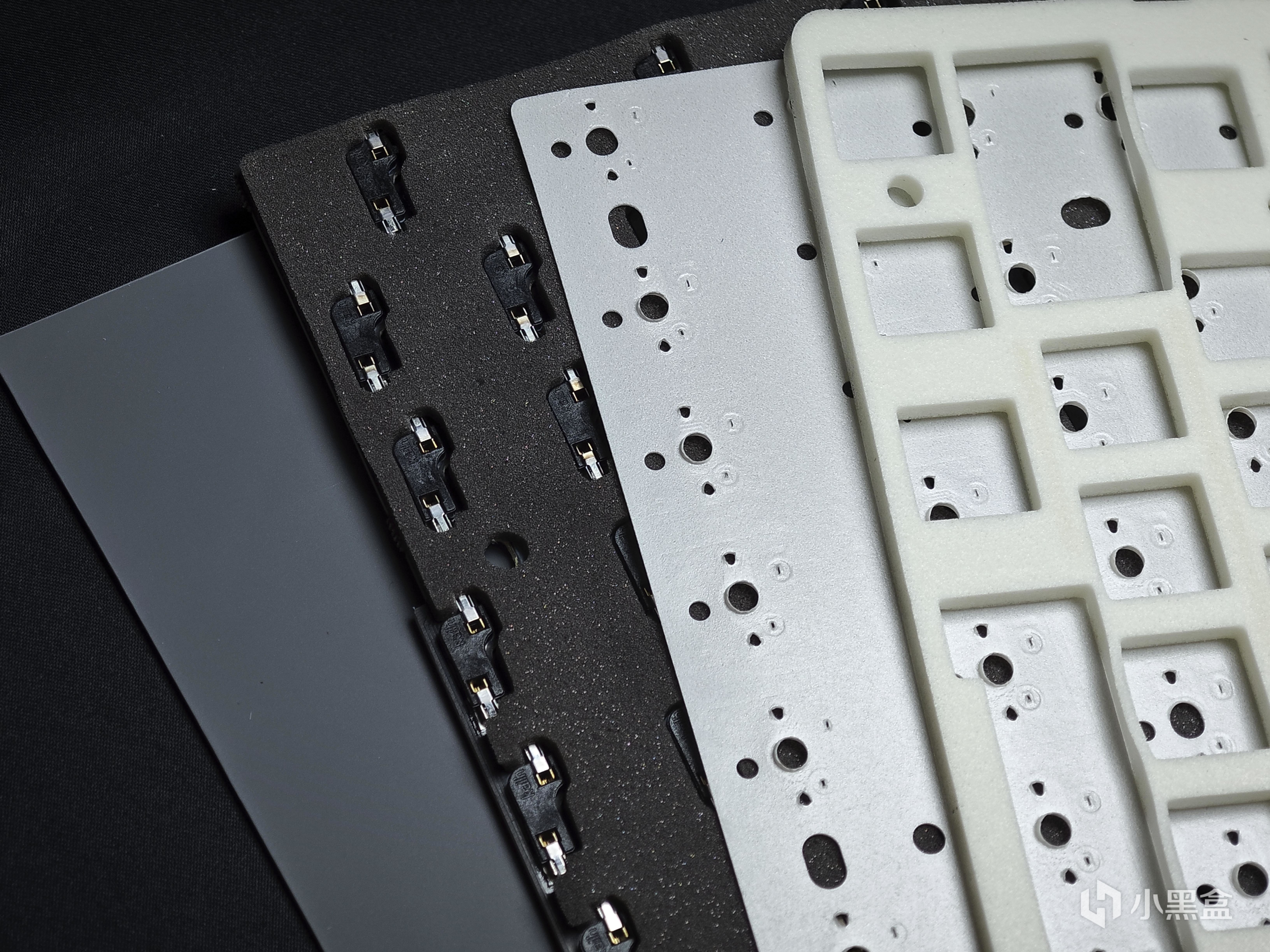 定位板方面採用的是開槽的PC定位板,相較於不開槽來說有更好的軟彈性以及聲音,頂配版本採用的是單鍵開槽的FR4定位板,相較於PC定位板來說更脆,觸底更集中。