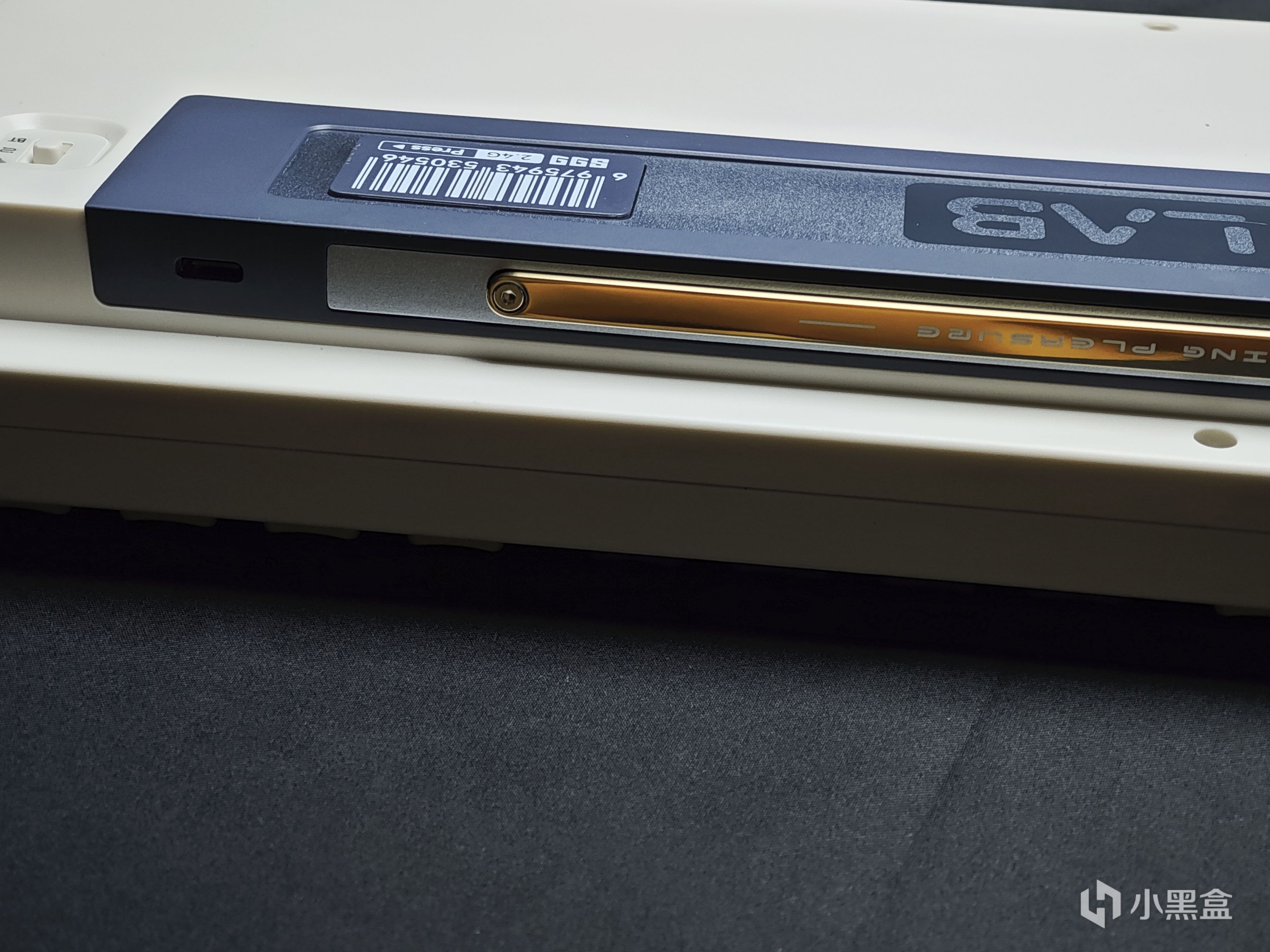 後側面能看到在下面底殼旁邊有做一個金屬條裝飾,你別說做的確實好看。鍵盤的接口則是放在了偏右側的位置,而不是放在中間,如果有航插線搭配的話還不錯。