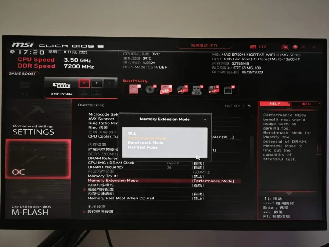 接下来跟着我一起优化内存性能,设置主板XMP 7200频率之后,在主板BIOS找到OC选项,点击BIOS Memory Extension Mode,将其设为Performance Mode,F10保存即可。