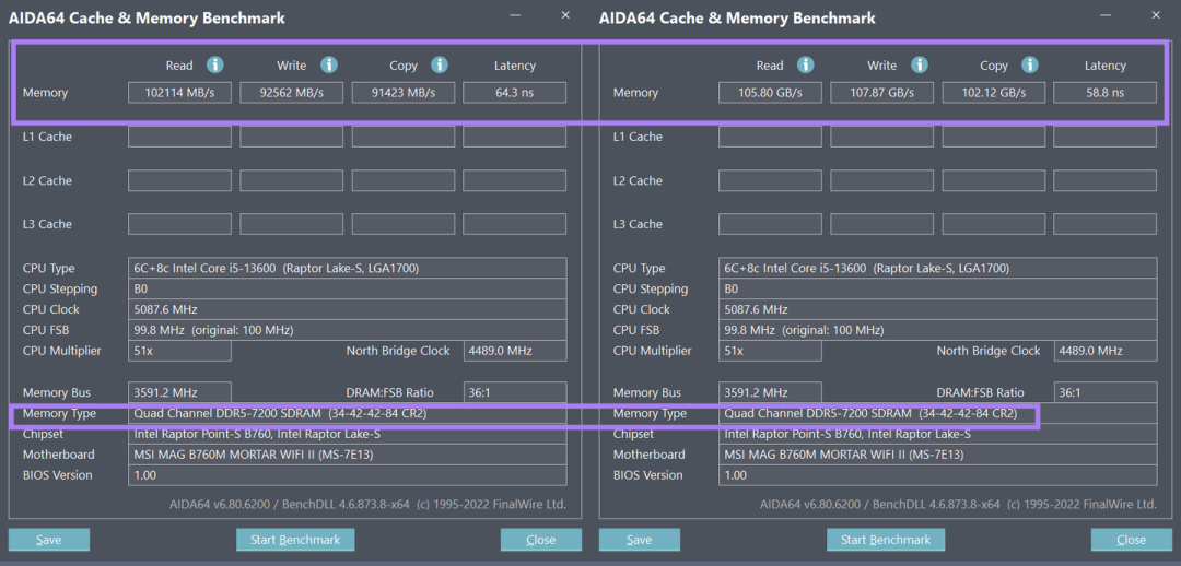 同样是XMP 7200频率,微星的Performance Mode,内存延迟大幅降低从64.3降到了58.8,读取提升到105G左右,写入提升到107G左右,相比默认的XMP 7200频率的内存效能有大幅的提升。