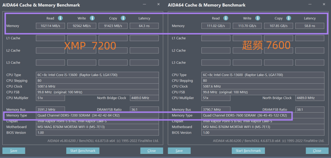 使用微星Memory Try IT 一键超频 7600频率,延迟大幅降低从64.3降到了58.8,读取111G左右,写入113G左右,相比XMP 7200频率的内存效能有大幅的提升.