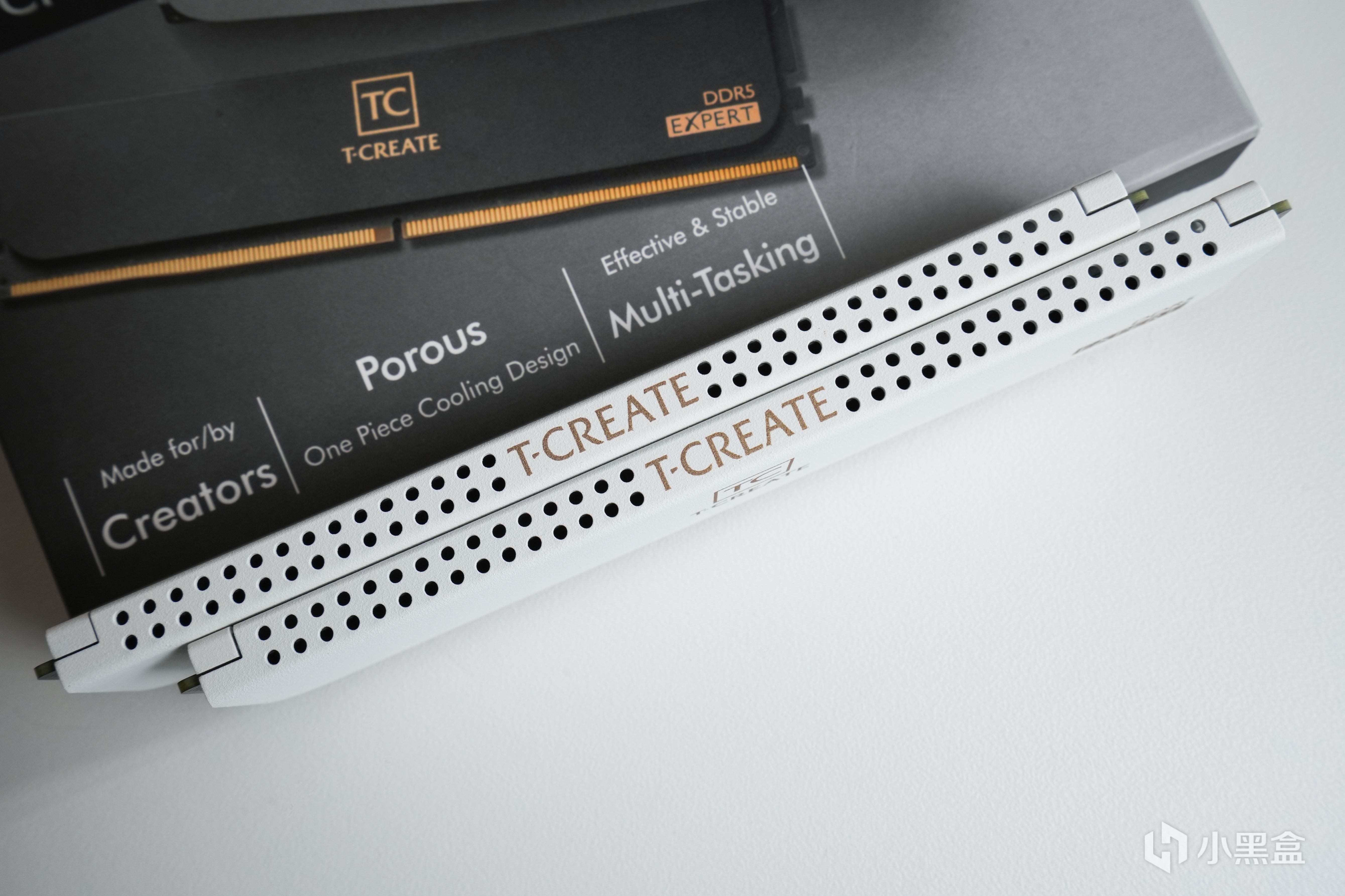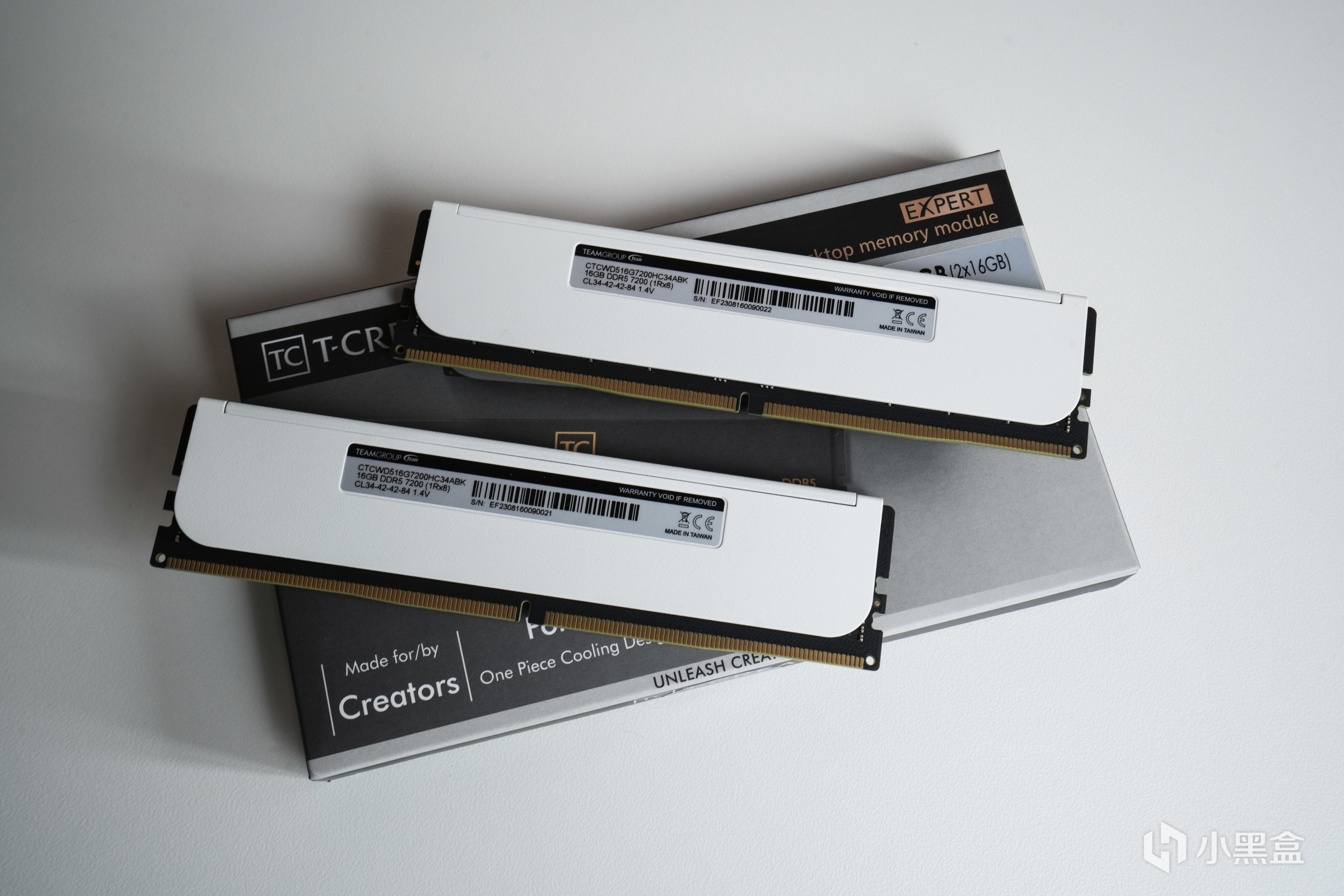这款十铨D5内存的外包装 可以出来是EXPERT系列,这个系列定位于高性能的创作者(包含游戏点击的视频创作),内存贴纸印有XMP 7200频率,时序34-42-42-84,电压1.4V。