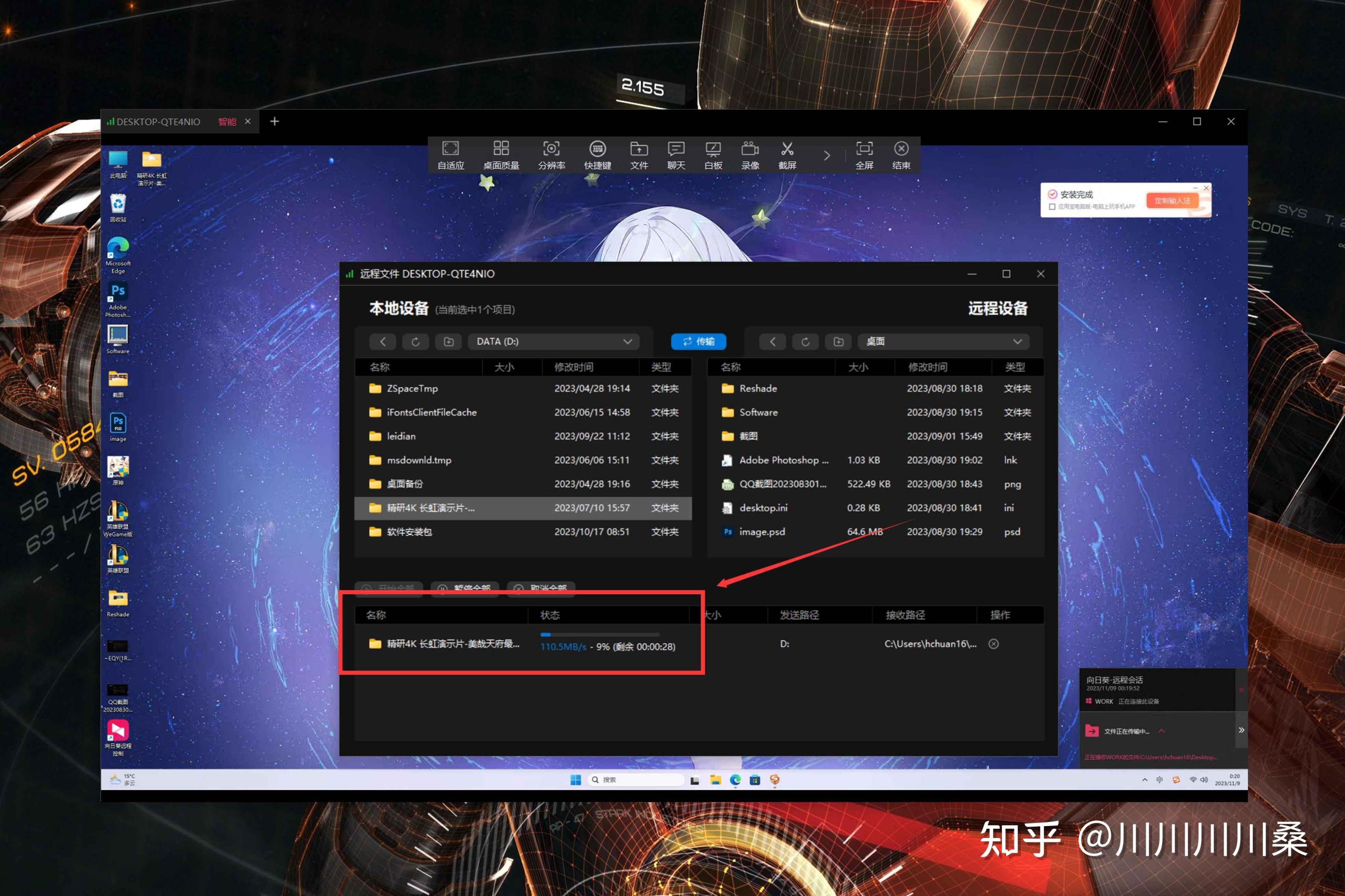 现在主流远控软件都不做限速了,所以传输速度的快慢和远控工具关系不会很大,这里内网传输可以轻松跑到115MB/s。