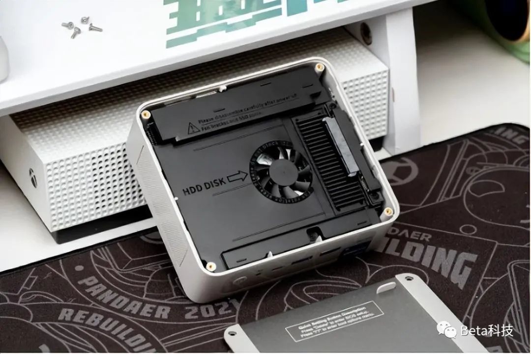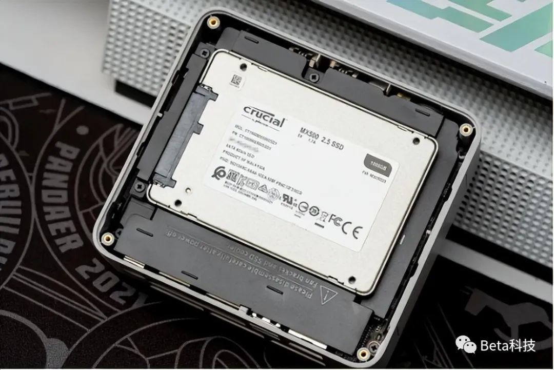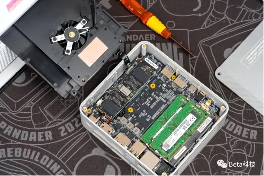 到这里就可以看到主机内置的NVMe固态硬盘和内存等元件了。如果你买的是准系统,来到这里就可以自己动手安装硬盘和内存了。这里还有一个小细节,SATA硬盘仓上对应NVMe固态硬盘的位置还贴有导热硅胶贴,零刻在散热上考虑的很周到。