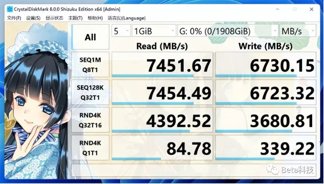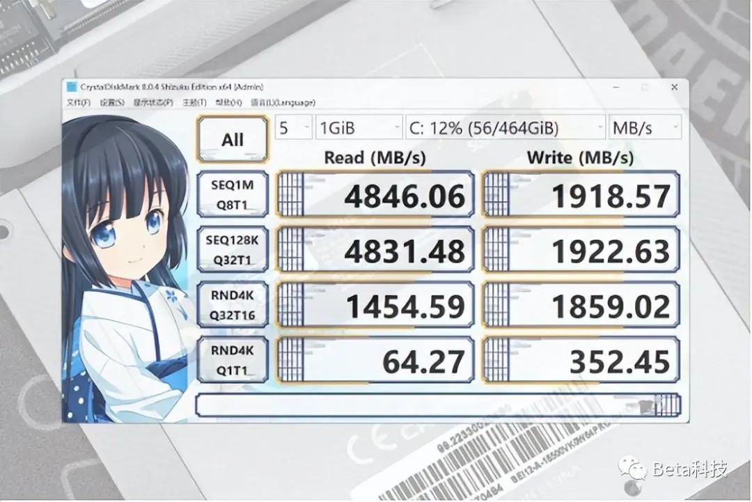 我手里这台SEi12 12450H使用的NVMe固态硬盘同样是英睿达的,PCIe 4.0规格。实测这款硬盘的顺序读取速度能够跑到约4800MB/s,顺序写入速度明显没有读取速度强,只有约1900MB/s。