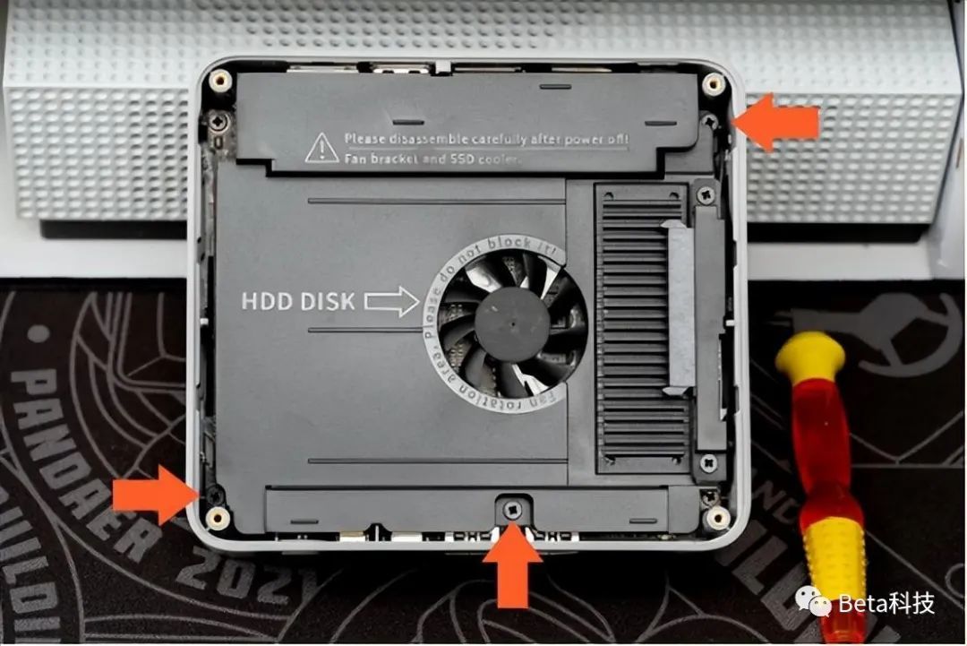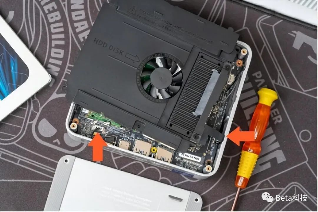 注意箭头位置在硬盘仓下面有风扇电源线和硬盘数据排线,拆解要小心,不要扯断这两条线。