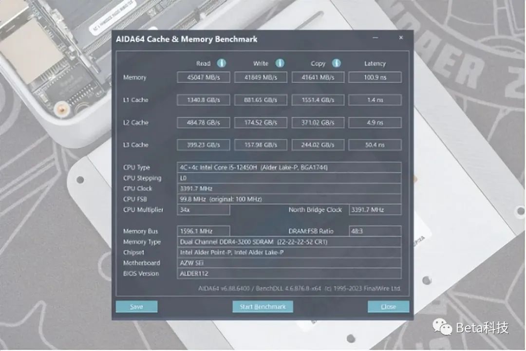 SEi12 12450H使用的是3200MHz的DDR4内存,时序22-22-22-52,说实话这个时序还是稍微有点儿高的。我台式机使用的3600MHz的DDR4内存时序只有16-18-18-38,延迟63ns。英睿达的内存延迟有100.9ns,这个数值并不算太优秀。