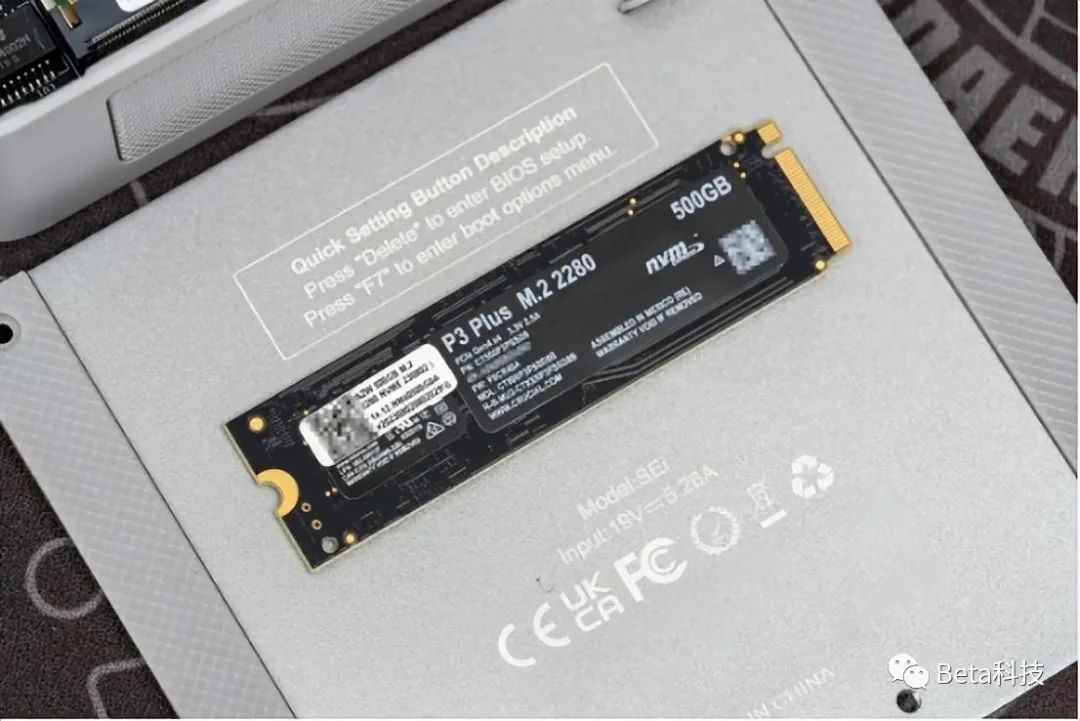 我手里这台SEi12 12450H主机使用的是一块英睿达P3 Plus NVMe固态硬盘,PCIe 4.0规格,容量500GB。其实现在500GB的容量已经是不够用了,一个游戏100GB以上是越来越常见。500GB的硬盘适合分一个分区做系统盘,另外再挂一块硬盘存储数据。