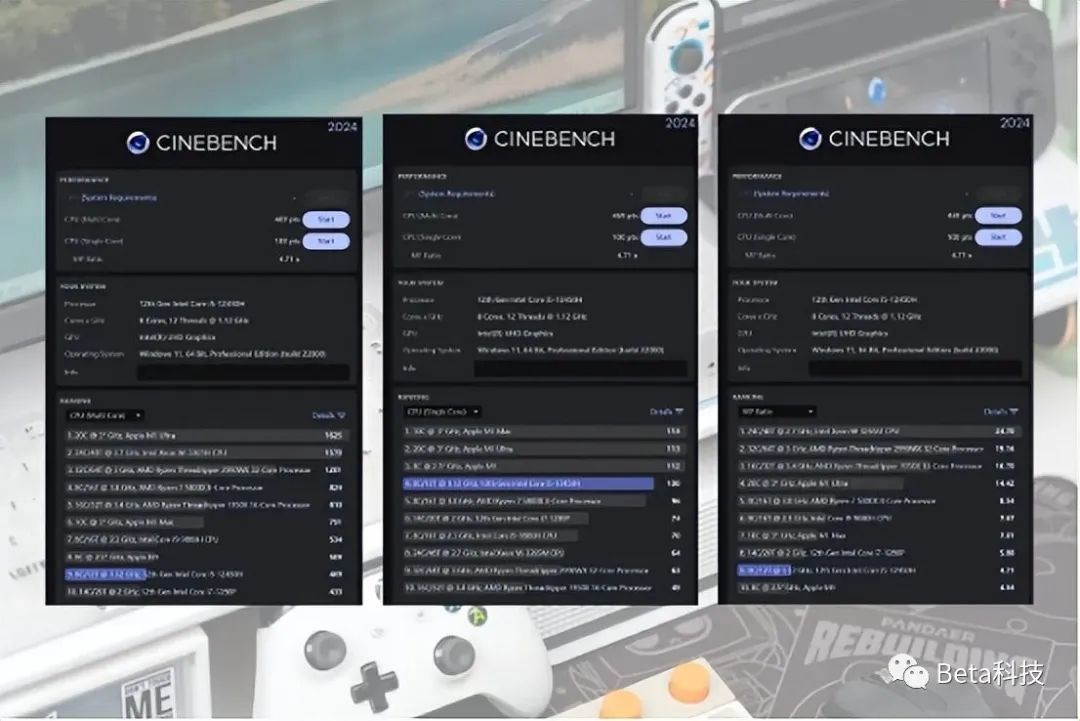 CINEBENCH 2024中12450H的单核得分约为100,落后苹果的M1芯片约11%。多核心成绩约469,落后苹果M1芯片约8%。