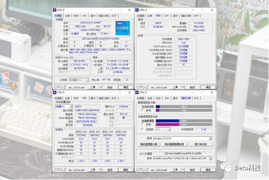 通过CPU-Z软件可以了解到这款主机的CPU、内存等硬件的参数。在处理器选项卡里可以看到i5-12450H这款处理器的TDP功耗、核心数量、缓存大小、支持的指令集等参数。我比较关心的是CPU的性能,在测试分数选项卡里可以测到12450H的单核得分约为685,多核心得分约为3698。12450H的单核性能约是i7-8700K的125%,多核心性能两者基本持平。