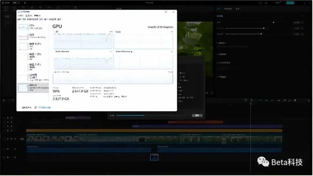 使用SEi12 12450H剪辑一条5分钟的4K 50帧视频,多条轨道加多种特效,拖动滚动条还是非常流畅。别看intel研发游戏显卡的能力不如NVIDIA和AMD,但是intel的核显在视频剪辑方面还是很给力的。最终这条5分钟的视频花费了14分15秒导出。在导出过程中CPU的占用率一直在40%左右,GPU倒是挺忙的,占用率会达到99%,可见核显在剪辑视频的时候确实是很卖力气的工作。