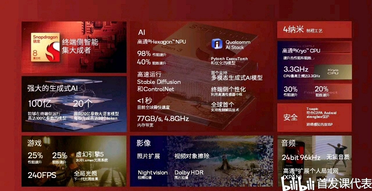 ◆ Snapdragon Smart(AI):Hexagon NPU,AI 性能最高提升 98%,能效提升 40%,同性能功耗下降 43%,可以在设备上运行生成式 AI 模型,将会支持 20 多种 AI 模型;
