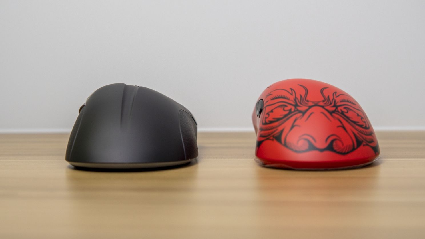 兩款鼠標雖然外觀相像,但模具設計上還是有一些小區別。具體在鼠標的背部,從下圖可以看到,M5 Pro的背部下降要比蝰蛇V3更陡一些。如果你玩過雷蛇的老產品,會發現這次的M5Pro的模具更像是幾年前的曼巴蛇,當然現在的曼巴蛇已經是曼巴眼鏡蛇了,感興趣的話可以翻一下主頁評測。