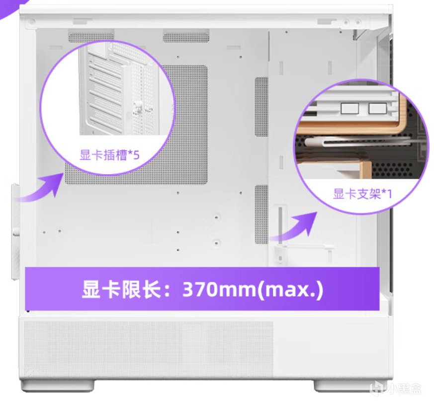 它的脚垫是扁长形状的,让人十分满意,可显卡的限长最高仅支持到370mm,对于长度342mm 的RTX 4080雪鹰OC显卡会显得非常有限。