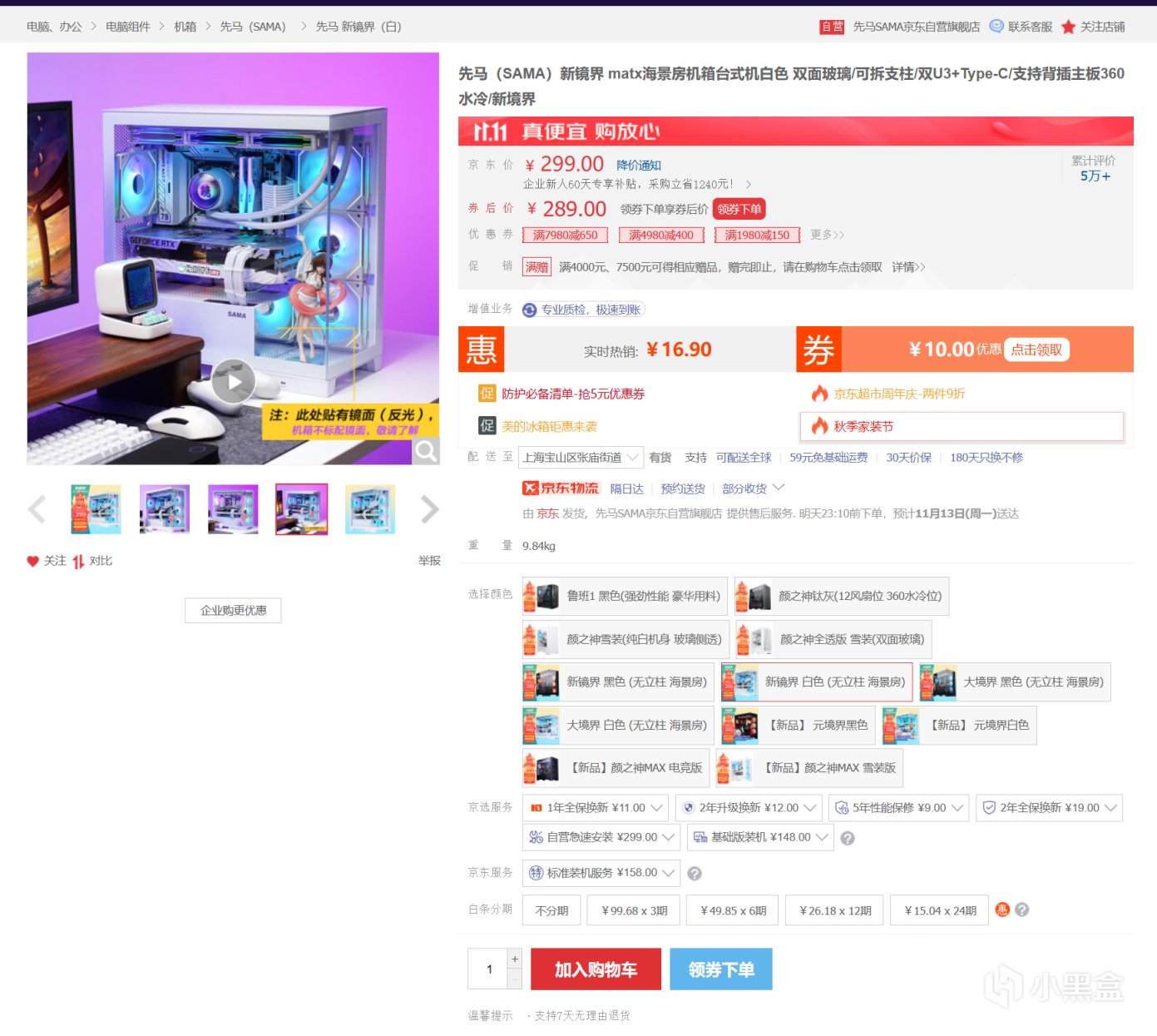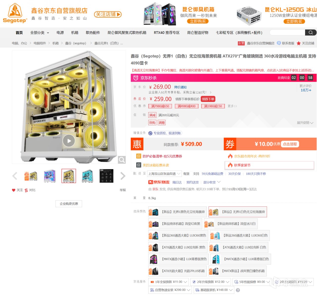 300元预算,需要具备270度可视角度,并且以“海景房”标称的机箱中,按照京东销量排名我选出了四款产品:分别是先马新镜界 matx海景房机箱、鑫谷(Segotep)无界1、爱国者(aigo)星璨 小岚和超频三星界C3 T500 WH。