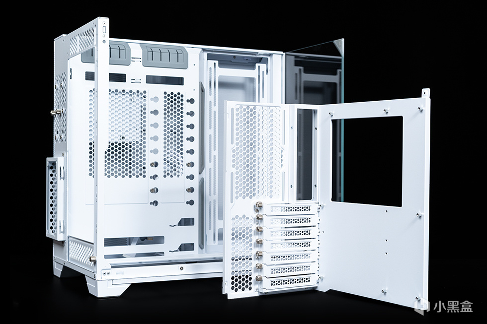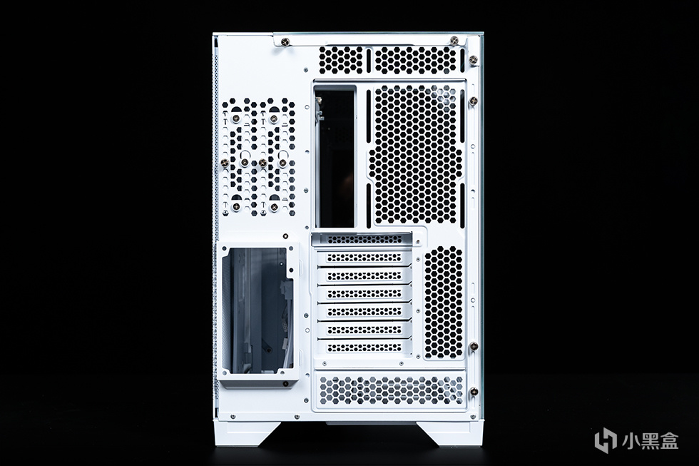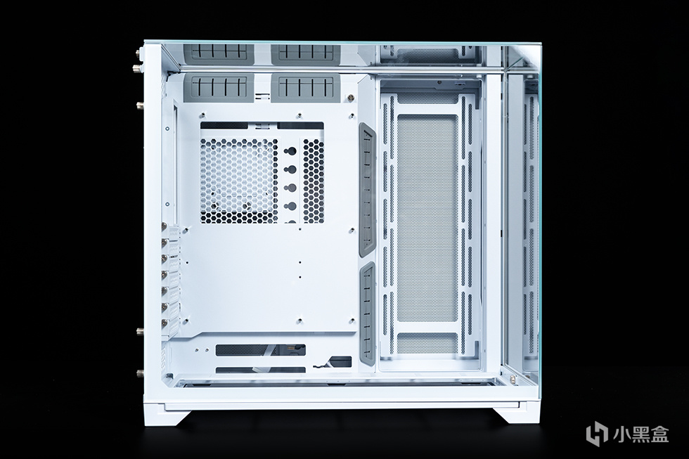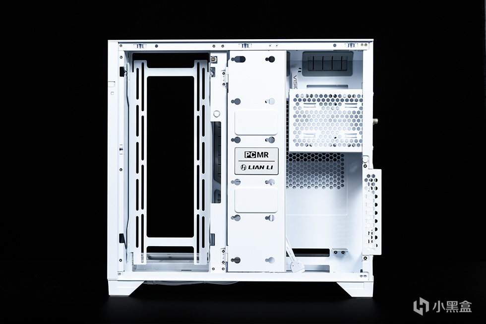 機箱背面結構,左側爲冷排及風扇支架,中間位置爲理,右側位置爲硬盤倉及電源倉安裝位。背倉左邊的側邊支架支持拆卸,取下固定的手旋螺絲之後,就可以按壓解釦側邊風扇架。支架是可以翻轉的,這樣就可以在主分艙或第二分艙中提供更多間隙空間。