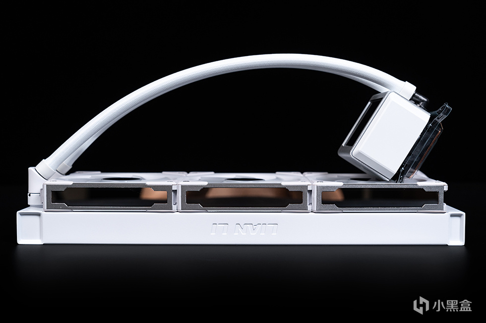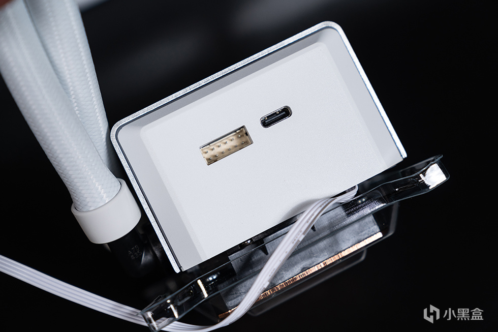 冷頭內部搭載了最新款的Asetek第八代水泵,採用三相馬達,在3600 RPM 的轉速下提供流量更高且更安靜的運轉,與第七代相比,可提供2°C/100W的效能提升。在冷頭側面可以看到2個線纜接口,一個USB Type-C的接口可用於連接水泵塊與 主板上的9針USB排針以支持L-Connect 3功能。另一個接近AIO管道的12針接口則是用於連接風扇以及SATA電源連接器。同時,從水泵塊下方伸出的4針PWM電纜線則是用於執行RPM控制。